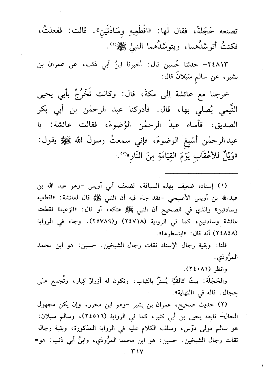 ٢٤٨١٣ - حَدَّثَنَا حُسَيْنٌ، قَالَ: أَخْبَرَنَا ابْنُ أَبِي ذِئْبٍ، عَنْ عِمْرَانَ بْنِ بَشِيرٍ، عَنْ سَالِمٍ سَبَلَانَ، قَالَ: خَرَجْنَا مَعَ عَائِشَةَ إِلَى مَكَّةَ، قَالَ: وَكَانَتْ تَخْرُجُ بِأَبِي يَحْيَى التَّيْمِيِّ يُصَلِّي بِهَا، قَالَ: فَأَدْرَكَنَا عَبْدُ الرَّحْمَنِ بْنُ أَبِي بَكْرٍ الصِّدِّيقِ، فَأَسَاءَ عَبْدُ الرَّحْمَنِ الْوُضُوءَ، فَقَالَتْ عَائِشَةُ: يَا عَبْدَ الرَّحْمَنِ، أَسْبِغِ الْوُضُوءَ، فَإِنِّي سَمِعْتُ رَسُولَ اللهِ صَلَّى اللهُ عَلَيْهِ وَسَلَّمَ، يَقُولُ: " وَيْلٌ لِلْأَعْقَابِ يَوْمَ الْقِيَامَةِ مِنَ النَّارِ " (٢)