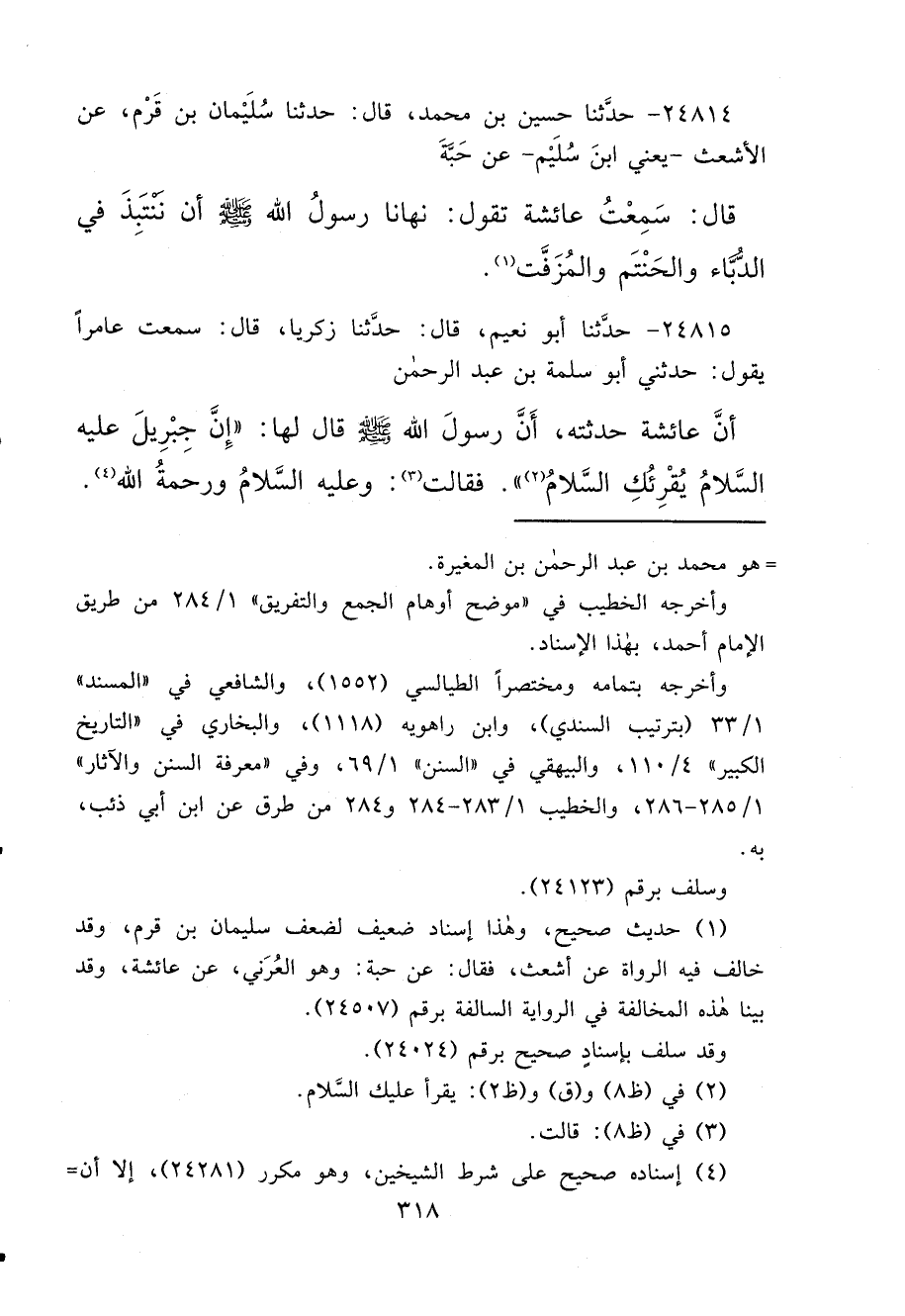 ٢٤٨١٤ - حَدَّثَنَا حُسَيْنُ بْنُ مُحَمَّدٍ، قَالَ: حَدَّثَنَا سُلَيْمَانُ بْنُ قَرْمٍ، عَنْ الْأَشْعَثِ يَعْنِي ابْنَ سُلَيْمٍ، عَنْ حَبَّةَ، قَالَ: سَمِعْتُ عَائِشَةَ، تَقُولُ: " نَهَانَا رَسُولُ اللهِ صَلَّى اللهُ عَلَيْهِ وَسَلَّمَ أَنْ نَنْتَبِذَ فِي الدُّبَّاءِ، وَالْحَنْتَمِ، وَالْمُزَفَّتِ " (١)