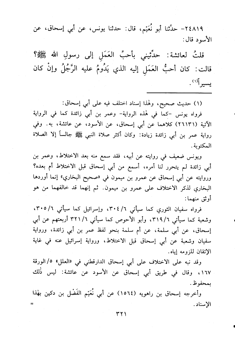 ٢٤٨١٩ - حَدَّثَنَا أَبُو نُعَيْمٍ، قَالَ: حَدَّثَنَا يُونُسُ، عَنْ أَبِي إِسْحَاقَ، عَنْ الْأَسْوَدِ، قَالَ: قُلْتُ لِعَائِشَةَ: حَدِّثِينِي بِأَحَبِّ الْعَمَلِ إِلَى رَسُولِ اللهِ صَلَّى اللهُ عَلَيْهِ وَسَلَّمَ، قَالَتْ: " كَانَ أَحَبُّ الْعَمَلِ إِلَيْهِ الَّذِي يَدُومُ عَلَيْهِ الرَّجُلُ، وَإِنْ كَانَ يَسِيرًا " (١)