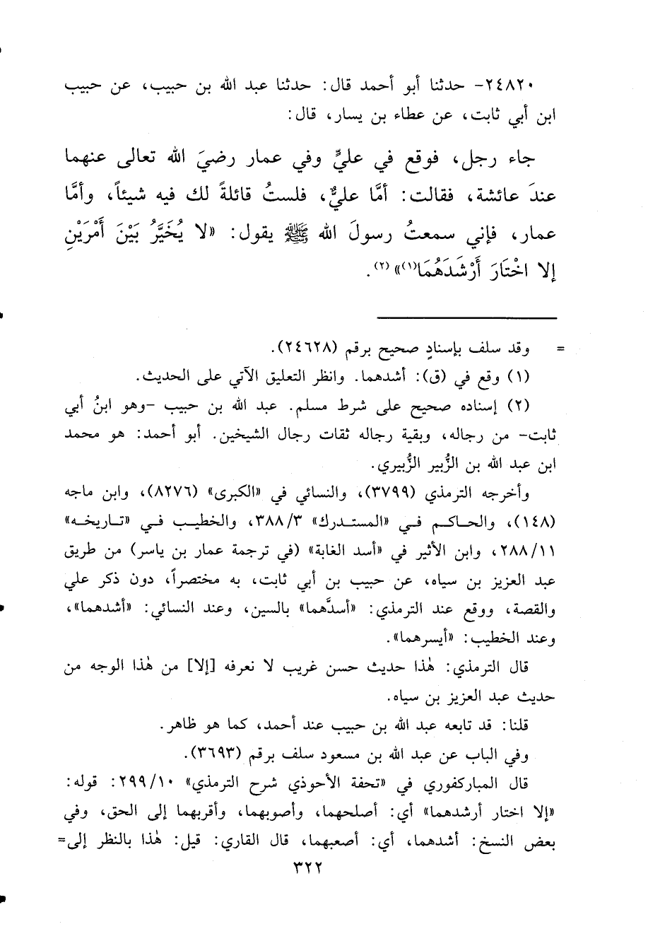 ٢٤٨٢٠ - حَدَّثَنَا أَبُو أَحْمَدَ، قَالَ: حَدَّثَنَا عَبْدُ اللهِ بْنُ حَبِيبٍ، عَنْ حَبِيبِ بْنِ أَبِي ثَابِتٍ، عَنْ عَطَاءِ بْنِ يَسَارٍ، قَالَ: جَاءَ رَجُلٌ فَوَقَعَ فِي عَلِيٍّ، وَفِي عَمَّارٍ رَضِيَ اللهُ تَعَالَى عَنْهُمَا عِنْدَ عَائِشَةَ، فَقَالَتْ: أَمَّا عَلِيٌّ، فَلَسْتُ قَائِلَةً لَكَ فِيهِ شَيْئًا، وَأَمَّا عَمَّارٌ، فَإِنِّي سَمِعْتُ رَسُولَ اللهِ صَلَّى اللهُ عَلَيْهِ وَسَلَّمَ، يَقُولُ: " لَا يُخَيَّرُ بَيْنَ أَمْرَيْنِ، إِلَّا اخْتَارَ أَرْشَدَهُمَا (١) " (٢)