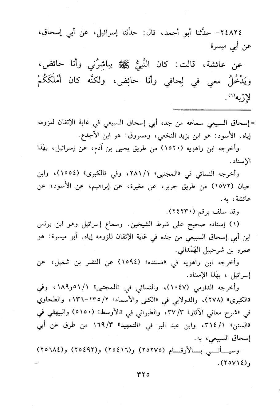 ٢٤٨٢٤ - حَدَّثَنَا أَبُو أَحْمَدَ، قَالَ: حَدَّثَنَا إِسْرَائِيلُ، عَنْ أَبِي إِسْحَاقَ، عَنْ أَبِي مَيْسَرَةَ، عَنْ عَائِشَةَ، قَالَتْ: " كَانَ النَّبِيُّ صَلَّى اللهُ عَلَيْهِ وَسَلَّمَ يُبَاشِرُنِي وَأَنَا حَائِضٌ، وَيَدْخُلُ مَعِي فِي لِحَافِي وَأَنَا حَائِضٌ، وَلَكِنَّهُ كَانَ أَمْلَكَكُمْ لِإِرْبِهِ " (١)