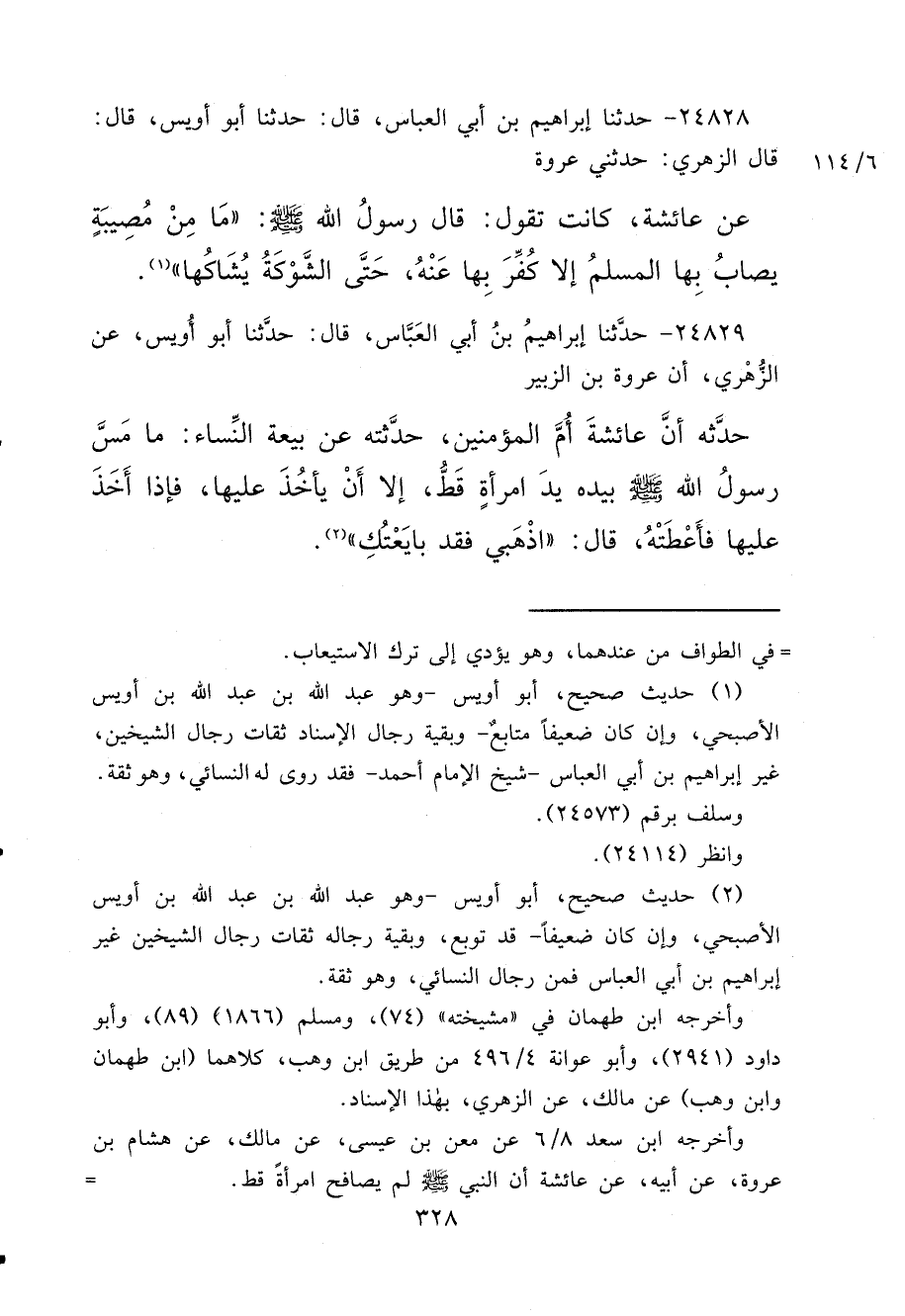 ٢٤٨٢٩ - حَدَّثَنَا إِبْرَاهِيمُ بْنُ أَبِي الْعَبَّاسِ، قَالَ: حَدَّثَنَا أَبُو أُوَيْسٍ، عَنْ الزُّهْرِيِّ، أَنَّ عُرْوَةَ بْنَ الزُّبَيْرِ، حَدَّثَهُ، أَنَّ عَائِشَةَ، أُمَّ الْمُؤْمِنِينَ حَدَّثَتْهُ عَنْ بَيْعَةِ النِّسَاءِ: مَا مَسَّ رَسُولُ اللهِ صَلَّى اللهُ عَلَيْهِ وَسَلَّمَ بِيَدِهِ يَدَ امْرَأَةٍ قَطُّ، إِلَّا أَنْ يَأْخُذَ عَلَيْهَا، فَإِذَا أَخَذَ عَلَيْهَا، فَأَعْطَتْهُ، قَالَ: " اذْهَبِي فَقَدْ بَايَعْتُكِ " (٢)