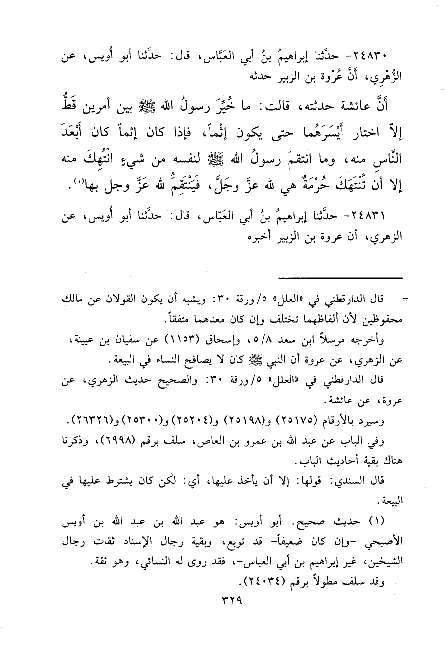 ٢٤٨٣٠ - حَدَّثَنَا إِبْرَاهِيمُ بْنُ أَبِي الْعَبَّاسِ، قَالَ: حَدَّثَنَا أَبُو أُوَيْسٍ، عَنْ الزُّهْرِيِّ، أَنَّ عُرْوَةَ بْنَ الزُّبَيْرِ، حَدَّثَهُ أَنَّ عَائِشَةَ حَدَّثَتْهُ، قَالَتْ: " مَا خُيِّرَ رَسُولُ اللهِ صَلَّى اللهُ عَلَيْهِ وَسَلَّمَ بَيْنَ أَمْرَيْنِ قَطُّ إِلَّا اخْتَارَ أَيْسَرَهُمَا، حَتَّى يَكُونَ إِثْمًا، فَإِذَا كَانَ إِثْمًا كَانَ أَبْعَدَ النَّاسِ مِنْهُ، وَمَا انْتَقَمَ رَسُولُ اللهِ صَلَّى اللهُ عَلَيْهِ وَسَلَّمَ لِنَفْسِهِ مِنْ شَيْءٍ انْتُهِكَ مِنْهُ، إِلَّا أَنْ تُنْتَهَكَ حُرْمَةٌ هِيَ لِلَّهِ عَزَّ وَجَلَّ، فَيَنْتَقِمُ لِلَّهِ عَزَّ وَجَلَّ بِهَا " (١)