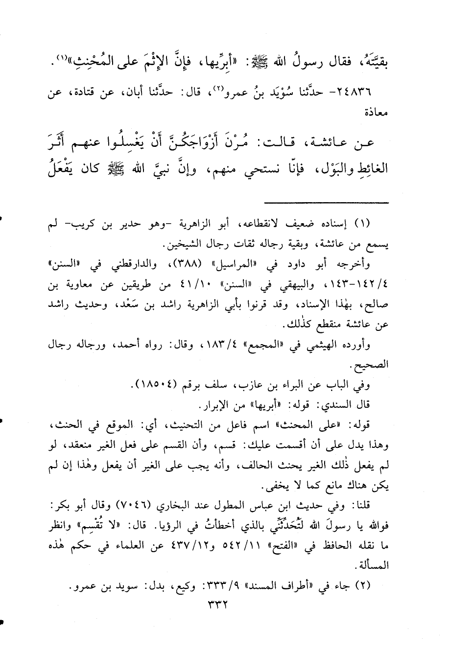 ٢٤٨٣٦ - حَدَّثَنَا سُوَيْدُ بْنُ عَمْرٍو (٢) ، قَالَ: حَدَّثَنَا أَبَانُ، عَنْ قَتَادَةَ، عَنْ مُعَاذَةَ، عَنْ عَائِشَةَ، قَالَتْ: " مُرْنَ أَزْوَاجَكُنَّ أَنْ يَغْسِلُوا عَنْهُمْ أَثَرَ الْغَائِطِ وَالْبَوْلِ، فَإِنَّا نَسْتَحِي مِنْهُمْ، وَإِنَّ نَبِيَّ اللهِ صَلَّى اللهُ عَلَيْهِ وَسَلَّمَ كَانَ يَفْعَلُ
