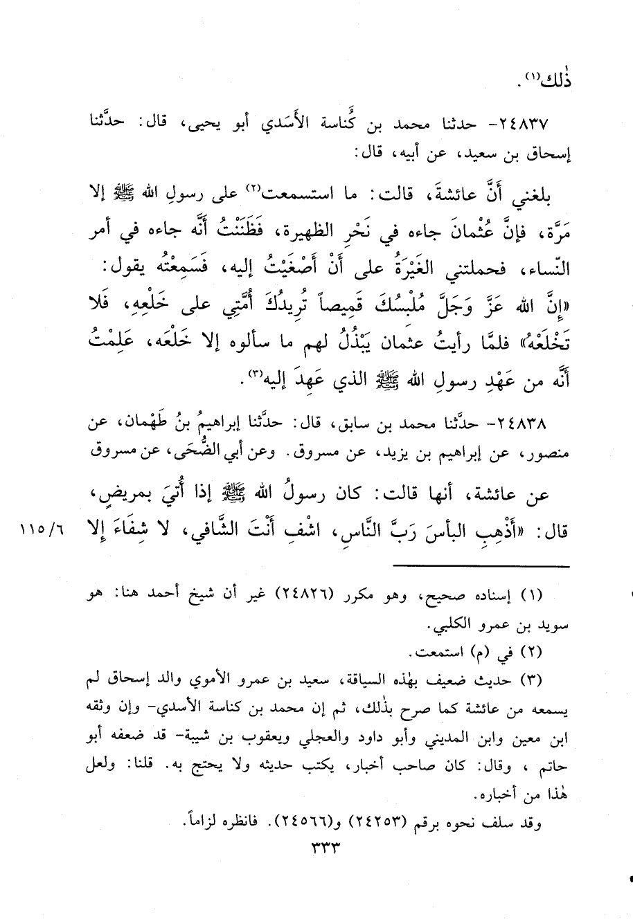 ٢٤٨٣٧ - حَدَّثَنَا مُحَمَّدُ بْنُ كُنَاسَةَ الْأَسَدِيُّ أَبُو يَحْيَى، قَالَ: حَدَّثَنَا إِسْحَاقُ بْنُ سَعِيدٍ، عَنْ أَبِيهِ، قَالَ: بَلَغَنِي أَنَّ عَائِشَةَ، قَالَتْ: مَا اسْتَسْمَعْتُ (٢) عَلَى رَسُولِ اللهِ صَلَّى اللهُ عَلَيْهِ وَسَلَّمَ إِلَّا مَرَّةً، فَإِنَّ عُثْمَانَ جَاءَهُ فِي نَحْرِ الظَّهِيرَةِ، فَظَنَنْتُ أَنَّهُ جَاءَهُ فِي أَمْرِ النِّسَاءِ، فَحَمَلَتْنِي الْغَيْرَةُ عَلَى أَنْ أَصْغَيْتُ إِلَيْهِ، فَسَمِعْتُهُ يَقُولُ: " إِنَّ اللهَ عَزَّ وَجَلَّ مُلْبِسُكَ قَمِيصًا تُرِيدُكَ أُمَّتِي عَلَى خَلْعِهِ، فَلَا تَخْلَعْهُ "، فَلَمَّا رَأَيْتُ عُثْمَانَ يَبْذُلُ لَهُمْ مَا سَأَلُوهُ إِلَّا خَلْعَهُ، عَلِمْتُ أَنَّهُ مِنْ عَهْدِ رَسُولِ اللهِ صَلَّى اللهُ عَلَيْهِ وَسَلَّمَ الَّذِي عَهِدَ إِلَيْهِ (٣)