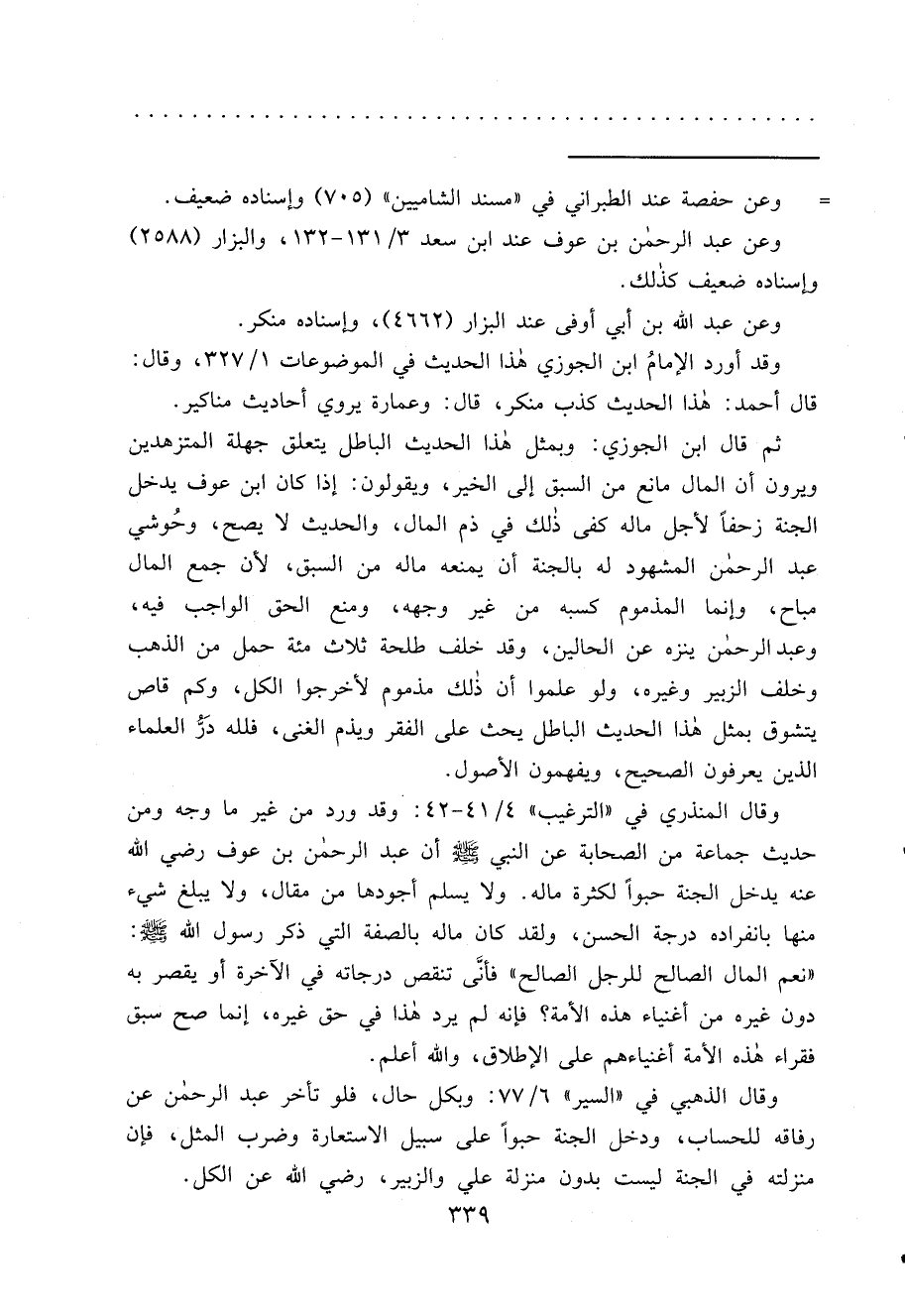 ثم قال ابن الجوزي: وبمثل هذا الحديث الباطل يتعلق جهلة المتزهدين ويرون أن المال مانع من السبق إلى الخير، ويقولون: إذا كان ابن عوف يدخل الجنة زحفاً لأجل ماله كفى ذلك في ذم المال، والحديث لا يصح، وحُوشي عبد الرحمن المشهود له بالجنة أن يمنعه ماله من السبق، لأن جمع المال مباح، وإنما المذموم كسبه من غير وجهه، ومنع الحق الواجب فيه، وعبد الرحمن ينزه عن الحالين، وقد خلف طلحة ثلاث مئة حمل من الذهب وخلف الزبير وغيره، ولو علموا أن ذلك مذموم لأخرجوا الكل، وكم قاص يتشوق بمثل هذا الحديث الباطل يحث على الفقر ويذم الغنى، فلله دَرُّ العلماء الذين يعرفون الصحيح، ويفهمون الأصول.