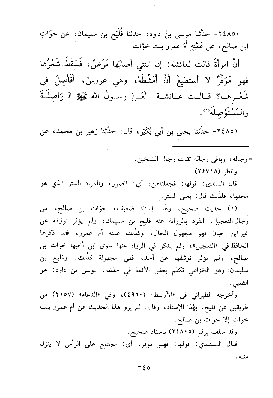 ٢٤٨٥٠ - حَدَّثَنَا مُوسَى بْنُ دَاوُدَ، حَدَّثَنَا فُلَيْحُ بْنُ سُلَيْمَانَ، عَنْ خَوَّاتِ بْنِ صَالِحٍ، عَنْ عَمَّتِهِ أُمِّ عَمْرٍو بِنْتِ خَوَّاتٍ، أَنَّ امْرَأَةً قَالَتْ لِعَائِشَةَ: إِنَّ ابْنَتِي أَصَابَهَا مَرَضٌ، فَسَقَطَ شَعَرُهَا، فَهُوَ مُوَفَّرٌ، لَا أَسْتَطِيعُ أَنْ أُمَشِّطَهُ، وَهِيَ عَرُوسٌ، أَفَأَصِلُ فِي شَعَرِهَا؟ قَالَتْ عَائِشَةُ: " لَعَنَ رَسُولُ اللهِ صَلَّى اللهُ عَلَيْهِ وَسَلَّمَ، الْوَاصِلَةَ، وَالْمُسْتَوْصِلَةَ " (١)