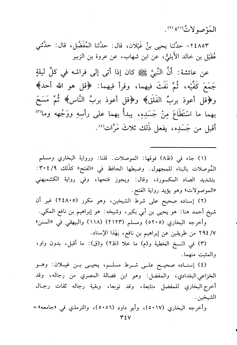 ٢٤٨٥٣ - حَدَّثَنَا يَحْيَى بْنُ غَيْلَانَ، قَالَ: حَدَّثَنَا الْمُفَضَّلُ، قَالَ: حَدَّثَنِي عُقَيْلُ بْنُ خَالِدٍ الْأَيْلِيُّ، عَنْ ابْنِ شِهَابٍ، عَنْ عُرْوَةَ بْنِ الزُّبَيْرِ، عَنْ عَائِشَةَ، " أَنَّ النَّبِيَّ صَلَّى اللهُ عَلَيْهِ وَسَلَّمَ كَانَ إِذَا أَتَى إِلَى فِرَاشِهِ فِي كُلِّ لَيْلَةٍ جَمَعَ كَفَّيْهِ، ثُمَّ نَفَثَ فِيهِمَا، وَقَرَأَ فِيهِمَا: قُلْ هُوَ اللهُ أَحَدٌ، وَقُلْ أَعُوذُ بِرَبِّ الْفَلَقِ، وَقُلْ أَعُوذُ بِرَبِّ النَّاسِ، ثُمَّ مَسْحَ بِهِمَا مَا اسْتَطَاعَ مِنْ جَسَدِهِ، يَبْدَأُ بِهِمَا عَلَى رَأْسِهِ وَوَجْهِهِ وَمَا (٣) أَقْبَلَ مِنْ جَسَدِهِ، يَفْعَلُ ذَلِكَ ثَلَاثَ مَرَّاتٍ " (٤)