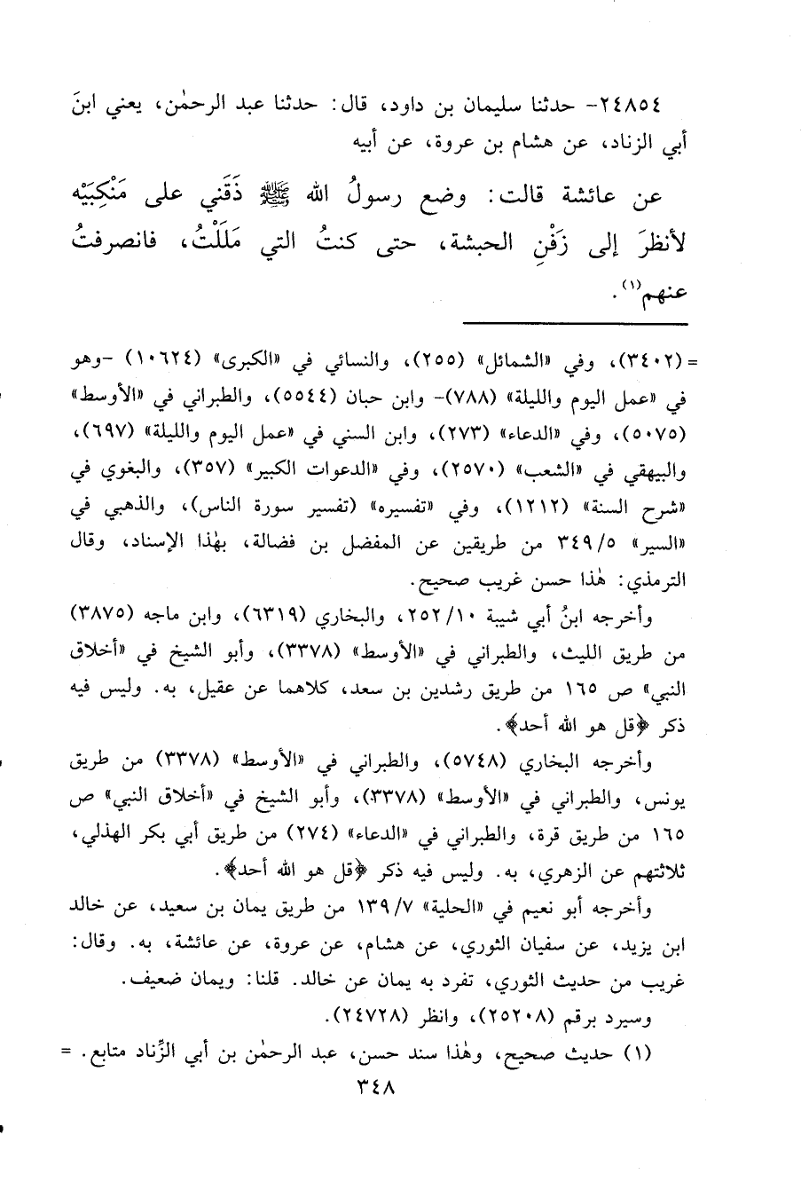 ٢٤٨٥٤ - حَدَّثَنَا سُلَيْمَانُ بْنُ دَاوُدَ، قَالَ: حَدَّثَنَا عَبْدُ الرَّحْمَنِ يَعْنِي ابْنَ أَبِي الزِّنَادِ، عَنْ هِشَامِ بْنِ عُرْوَةَ، عَنْ أَبِيهِ، عَنْ عَائِشَةَ، قَالَتْ: " وَضَعَ رَسُولُ اللهِ صَلَّى اللهُ عَلَيْهِ وَسَلَّمَ ذَقْنِي عَلَى مَنْكِبَيْهِ لِأَنْظُرَ إِلَى زَفْنِ الْحَبَشَةِ، حَتَّى كُنْتُ الَّتِي مَلِلْتُ، فَانْصَرَفْتُ عَنْهُمْ " (١)