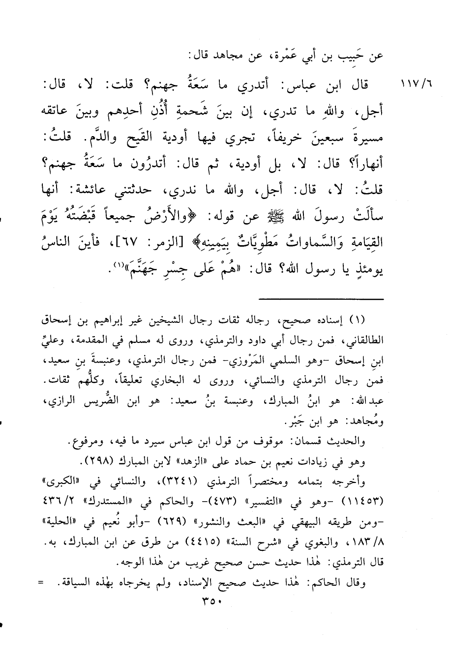 عَنْ حَبِيبِ بْنِ أَبِي عَمْرَةَ، عَنْ مُجَاهِدٍ، قَالَ: قَالَ ابْنُ عَبَّاسٍ: أَتَدْرِي مَا سِعَةُ جَهَنَّمَ؟ قُلْتُ: لَا، قَالَ: أَجَلْ، وَاللهِ مَا تَدْرِي، إِنَّ بَيْنَ شَحْمَةِ أُذُنِ أَحَدِهِمْ وَبَيْنَ عَاتِقِهِ مَسِيرَةَ سَبْعِينَ خَرِيفًا، تَجْرِي فِيهَا أَوْدِيَةُ الْقَيْحِ وَالدَّمِ، قُلْتُ: أَنْهَارًا؟ قَالَ: لَا، بَلْ أَوْدِيَةً، ثُمَّ قَالَ: أَتَدْرُونَ مَا سِعَةُ جَهَنَّمَ؟ قُلْتُ: لَا، قَالَ: أَجَلْ، وَاللهِ مَا نَدْرِي، حَدَّثَتْنِي عَائِشَةُ أَنَّهَا سَأَلَتْ رَسُولَ اللهِ صَلَّى اللهُ عَلَيْهِ وَسَلَّمَ عَنْ قَوْلِهِ: {وَالْأَرْضُ جَمِيعًا قَبْضَتُهُ يَوْمَ الْقِيَامَةِ وَالسَّمَاوَاتُ مَطْوِيَّاتٌ بِيَمِينِهِ} [الزمر: ٦٧] فَأَيْنَ النَّاسُ يَوْمَئِذٍ يَا رَسُولَ اللهِ؟ قَالَ: " هُمْ عَلَى جِسْرِ جَهَنَّمَ " (١)