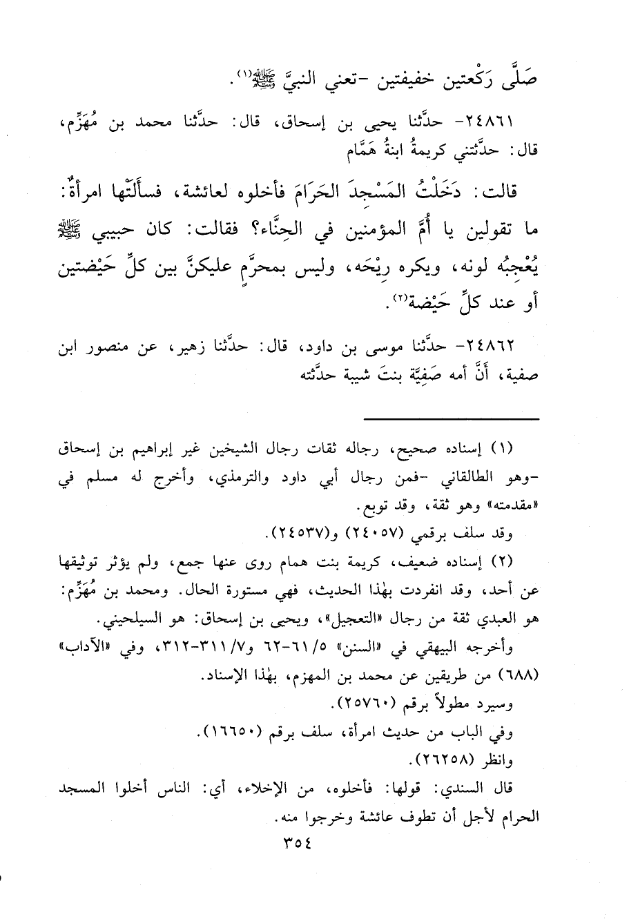 ٢٤٨٦١ - حَدَّثَنَا يَحْيَى بْنُ إِسْحَاقَ، قَالَ: حَدَّثَنَا مُحَمَّدُ بْنُ مِهْزَمٍ، قَالَ: حَدَّثَتْنِي كَرِيمَةُ ابْنَةُ هَمَّامٍ، قَالَتْ: دَخَلْتُ الْمَسْجِدَ الْحَرَامَ فَأَخْلَوْهُ لِعَائِشَةَ، فَسَأَلَتْهَا امْرَأَةٌ، مَا تَقُولِي يَا أُمَّ الْمُؤْمِنِينَ فِي الْحِنَّاءِ؟ فَقَالَتْ: " كَانَ حَبِيبِي صَلَّى اللهُ عَلَيْهِ وَسَلَّمَ يُعْجِبُهُ لَوْنُهُ، وَيَكْرَهُ رِيحَهُ وَلَيْسَ بِمُحَرَّمٍ عَلَيْكُنَّ بَيْنَ كُلِّ حَيْضَتَيْنِ، أَوْ عِنْدَ كُلِّ حَيْضَةٍ، " (٢)