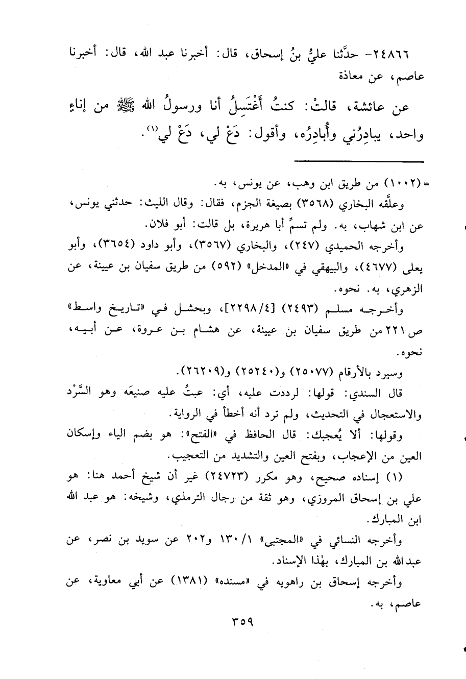 ٢٤٨٦٦ - حَدَّثَنَا عَلِيُّ بْنُ إِسْحَاقَ، قَالَ: أَخْبَرَنَا عَبْدُ اللهِ، قَالَ: أَخْبَرَنَا عَاصِمٌ، عَنْ مُعَاذَةَ، عَنْ عَائِشَةَ، قَالَتْ: " كُنْتُ أَغْتَسِلُ أَنَا وَرَسُولُ اللهِ صَلَّى اللهُ عَلَيْهِ وَسَلَّمَ مِنْ إِنَاءٍ وَاحِدٍ، يُبَادِرُنِي وَأُبَادِرُهُ، وَأَقُولُ: دَعْ لِي، دَعْ لِي " (١)