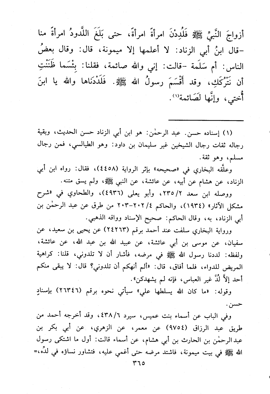 أَزْوَاجَ النَّبِيِّ صَلَّى اللهُ عَلَيْهِ وَسَلَّمَ، فَلُدِدْنَ امْرَأَةٌ امْرَأَةٌ، حَتَّى بَلَغَ اللَّدُودُ امْرَأَةً مِنَّا، قَالَ ابْنُ أَبِي الزِّنَادِ: لَا أَعْلَمُهَا، إِلَّا مَيْمُونَةَ، قَالَ: وَقَالَ بَعْضُ النَّاسِ: أُمُّ سَلَمَةَ، قَالَتْ: إِنِّي وَاللهِ صَائِمَةٌ، فَقُلْنَا: بِئْسَمَا ظَنَنْتِ أَنْ نَتْرُكَكِ، وَقَدْ أَقْسَمَ رَسُولُ اللهِ صَلَّى اللهُ عَلَيْهِ وَسَلَّمَ، فَلَدَدْنَاهَا وَاللهِ يَا ابْنَ أُخْتِي، وَإِنَّهَا لَصَائِمَةٌ (١)