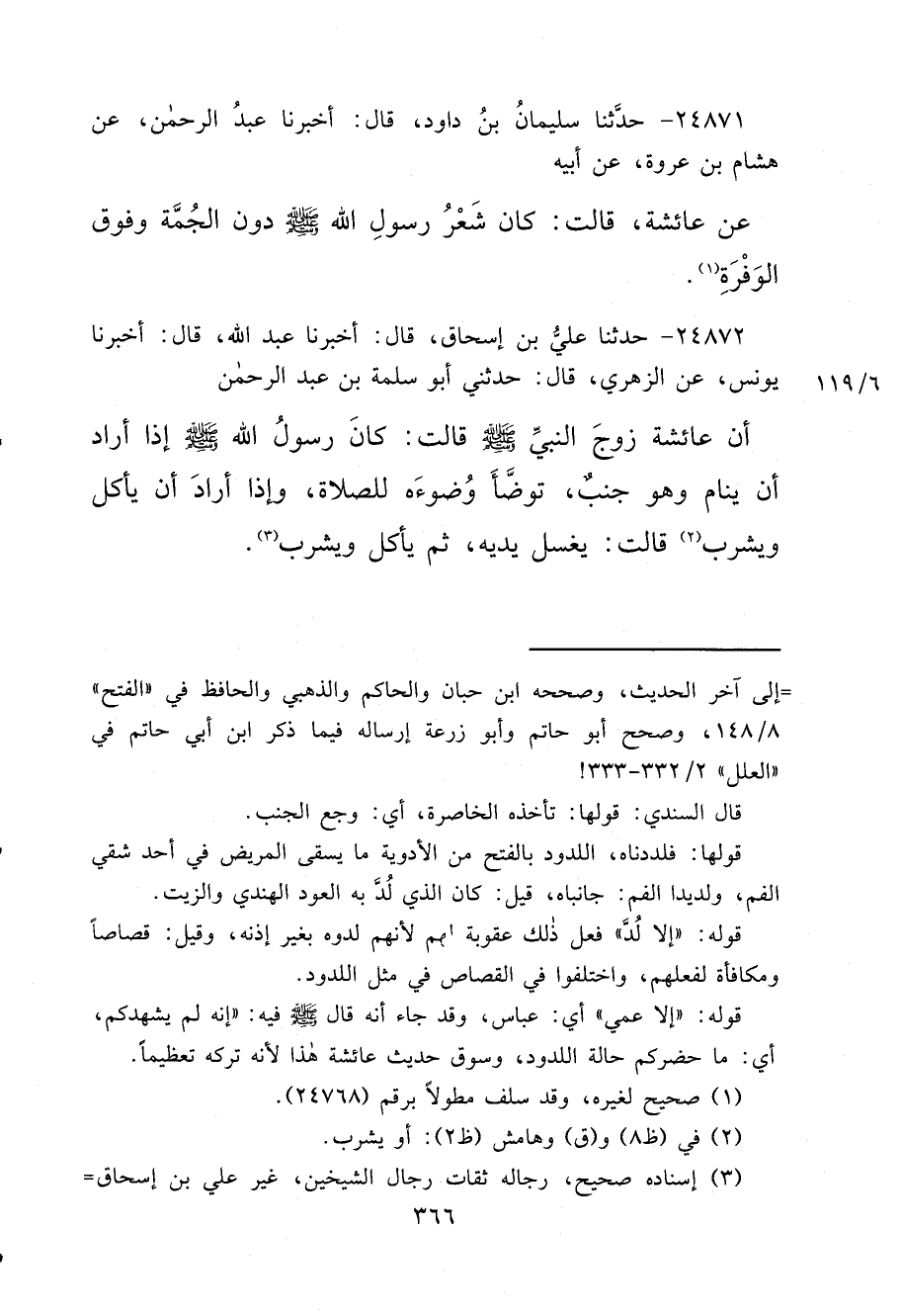 ٢٤٨٧٢ - حَدَّثَنَا عَلِيُّ بْنُ إِسْحَاقَ، قَالَ: أَخْبَرَنَا عَبْدُ اللهِ، قَالَ: أَخْبَرَنَا يُونُسُ، عَنْ الزُّهْرِيِّ، قَالَ: حَدَّثَنِي أَبُو سَلَمَةَ بْنُ عَبْدِ الرَّحْمَنِ، أَنَّ عَائِشَةَ، زَوْجَ النَّبِيِّ صَلَّى اللهُ عَلَيْهِ وَسَلَّمَ، قَالَتْ: " كَانَ رَسُولُ اللهِ صَلَّى اللهُ عَلَيْهِ وَسَلَّمَ إِذَا أَرَادَ أَنْ يَنَامَ وَهُوَ جُنُبٌ، تَوَضَّأَ وُضُوءَهُ لِلصَّلَاةِ، وَإِذَا أَرَادَ أَنْ يَأْكُلَ وَيَشْرَبَ، (٢) قَالَتْ:، يَغْسِلُ يَدَيْهِ، ثُمَّ يَأْكُلُ وَيَشْرَبُ "، (٣)