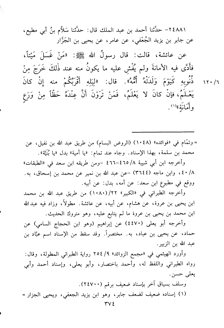 ٢٤٨٨١ - حَدَّثَنَا أَحْمَدُ بْنُ عَبْدِ الْمَلِكِ، قَالَ: حَدَّثَنَا سَلَّامُ بْنُ أَبِي مُطِيعٍ، عَنْ جَابِرِ بْنِ يَزِيدَ الْجُعْفِيِّ، عَنْ عَامِرٍ، عَنْ يَحْيَى بْنِ الْجَزَّارِ، عَنْ عَائِشَةَ، قَالَتْ: قَالَ رَسُولُ اللهِ صَلَّى اللهُ عَلَيْهِ وَسَلَّمَ: " مَنْ غَسَّلَ مَيِّتًا، فَأَدَّى فِيهِ الْأَمَانَةَ، وَلَمْ يُفْشِ عَلَيْهِ مَا يَكُونُ مِنْهُ عِنْدَ ذَلِكَ، خَرَجَ مِنْ ذُنُوبِهِ كَيَوْمِ وَلَدَتْهُ أُمُّهُ "، قَالَ: " لِيَلِهِ أَقْرَبُكُمْ مِنْهُ إِنْ كَانَ يَعْلَمُ، فَإِنْ كَانَ لَا يَعْلَمُ فَمَنْ تَرَوْنَ أَنَّ عِنْدَهُ حَظًّا مِنْ وَرَعٍ وَأَمَانَةٍ " (١)
