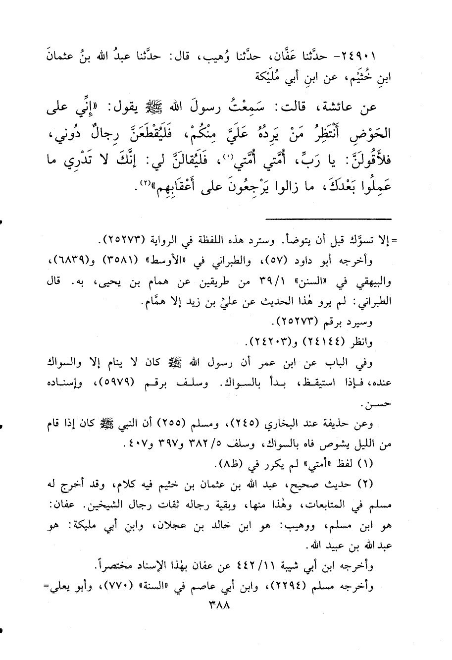 ٢٤٩٠١ - حَدَّثَنَا عَفَّانُ، حَدَّثَنَا وُهَيْبٌ، قَالَ: حَدَّثَنَا عَبْدُ اللهِ بْنُ عُثْمَانَ بْنِ خُثَيْمٍ، عَنِ ابْنِ أَبِي مُلَيْكَةَ، عَنْ عَائِشَةَ، قَالَتْ: سَمِعْتُ رَسُولَ اللهِ صَلَّى اللهُ عَلَيْهِ وَسَلَّمَ، يَقُولُ: " إِنِّي عَلَى الْحَوْضِ أَنْتَظِرُ مَنْ يَرِدُهُ عَلَيَّ مِنْكُمْ، فَلَيُقَطَّعَنَّ رِجَالٌ دُونِي، فَلَأَقُولَنَّ: يَا رَبِّ، أُمَّتِي أُمَّتِي، (١) فَلَيُقَالَنَّ لِي: إِنَّكَ لَا تَدْرِي مَا عَمِلُوا بَعْدَكَ، مَا زَالُوا يَرْجِعُونَ عَلَى أَعْقَابِهِمْ " (٢)