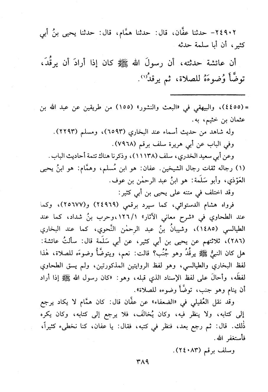 ٢٤٩٠٢ - حَدَّثَنَا عَفَّانُ، قَالَ: حَدَّثَنَا هَمَّامٌ، قَالَ: حَدَّثَنَا يَحْيَى بْنُ أَبِي كَثِيرٍ، أَنَّ أَبَا سَلَمَةَ، حَدَّثَهُ، أَنَّ عَائِشَةَ حَدَّثَتْهُ: " أَنَّ رَسُولَ اللهِ صَلَّى اللهُ عَلَيْهِ وَسَلَّمَ كَانَ إِذَا أَرَادَ أَنْ يَرْقُدَ، تَوَضَّأَ وُضُوءَهُ لِلصَّلَاةِ، ثُمَّ يَرْقُدُ " (١)