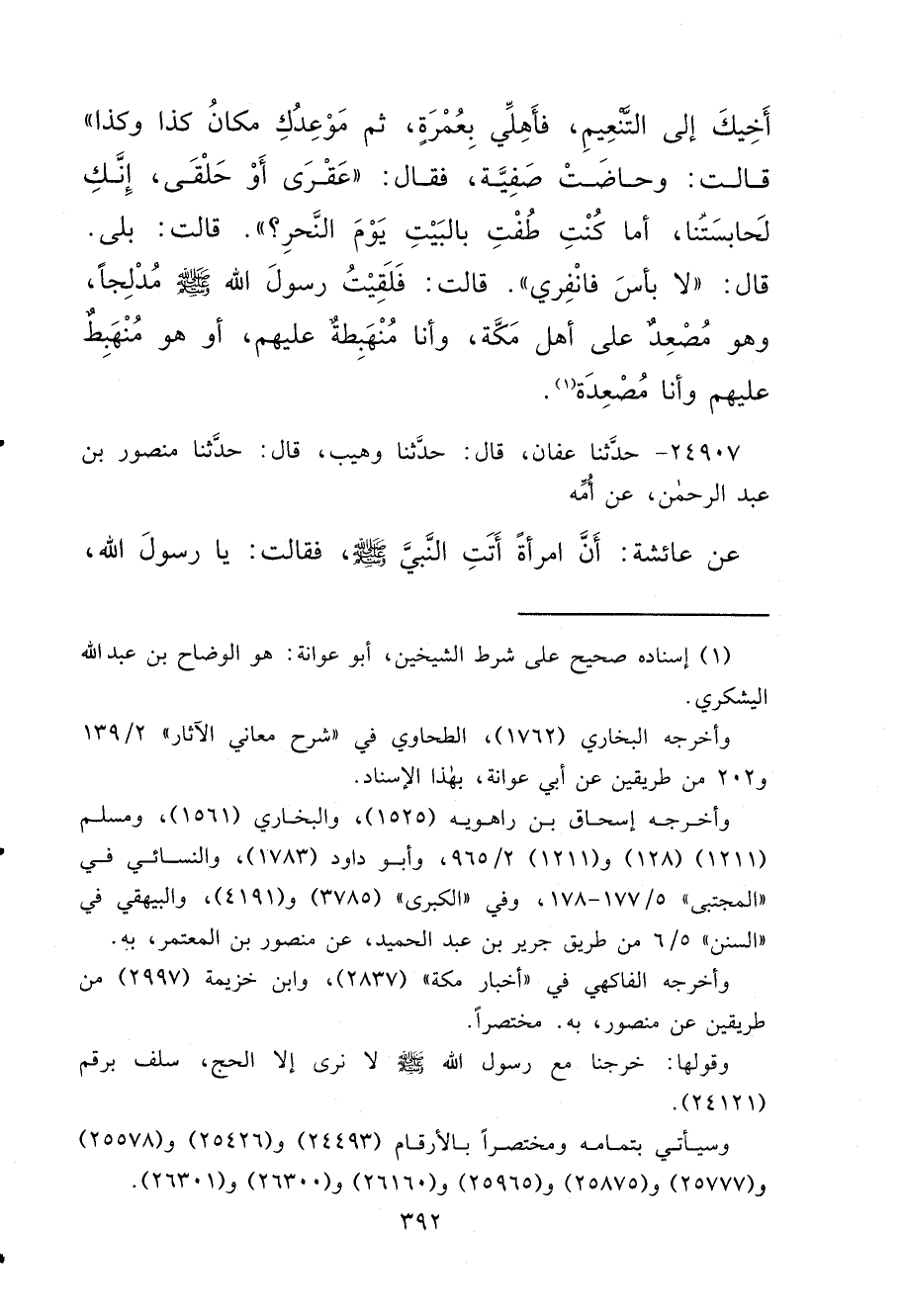 أَخِيكِ إِلَى التَّنْعِيمِ، فَأَهِلِّي بِعُمْرَةٍ، ثُمَّ مَوْعِدُكِ مَكَانَ كَذَا وَكَذَا "، قَالَتْ: وَحَاضَتْ صَفِيَّةُ، فَقَالَ: " عَقْرَى، أَوْ حَلْقَى، إِنَّكِ لَحَابِسَتُنَا، أَمَا كُنْتِ طُفْتِ بِالْبَيْتِ يَوْمَ النَّحْرِ؟ " قَالَتْ: بَلَى، قَالَ: " لَا بَأْسَ، فَانْفِرِي "، قَالَتْ: فَلَقِيتُ رَسُولَ اللهِ صَلَّى اللهُ عَلَيْهِ وَسَلَّمَ مُدْلِجًا وَهُوَ مُصْعِدٌ عَلَى أَهْلِ مَكَّةَ، وَأَنَا مُنْهَبِطَةٌ عَلَيْهِمْ، أَوْ هُوَ مُنْهَبِطٌ عَلَيْهِمْ وَأَنَا مُصْعِدَةٌ (١)