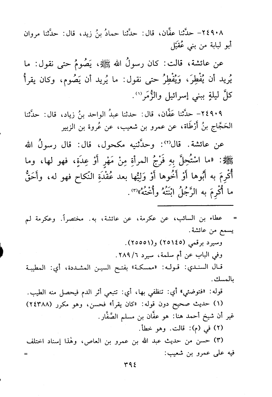 ٢٤٩٠٨ - حَدَّثَنَا عَفَّانُ، قَالَ: حَدَّثَنَا حَمَّادُ بْنُ زَيْدٍ، قَالَ: حَدَّثَنَا مَرْوَانُ أَبُو لُبَابَةَ، مِنْ بَنِي عُقَيْلٍ، عَنْ عَائِشَةَ، قَالَتْ: " كَانَ رَسُولُ اللهِ صَلَّى اللهُ عَلَيْهِ وَسَلَّمَ يَصُومُ حَتَّى نَقُولَ مَا يُرِيدُ أَنْ يُفْطِرَ، وَيُفْطِرُ حَتَّى نَقُولَ مَا يُرِيدُ أَنْ يَصُومَ، وَكَانَ يَقْرَأُ كُلَّ لَيْلَةٍ بِبَنِي إِسْرَائِيلَ، وَالزُّمَرِ " (١)