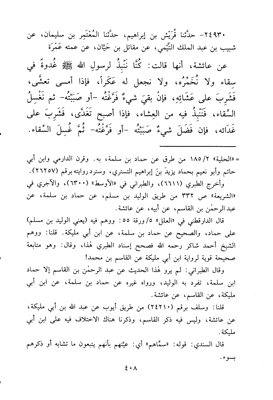 ٢٤٩٣٠ - حَدَّثَنَا قُرَيْشُ بْنُ إِبْرَاهِيمَ، حَدَّثَنَا الْمُعْتَمِرُ بْنُ سُلَيْمَانَ، عَنْ شَبِيبِ بْنِ عَبْدِ الْمَلِكِ التَّيْمِيِّ، عَنْ مُقَاتِلِ بْنِ حَيَّانَ، عَنْ عَمَّتِهِ عَمْرَةَ، عَنْ عَائِشَةَ، أَنَّهَا قَالَتْ: " كُنَّا نَنْبِذُ لِرَسُولِ اللهِ صَلَّى اللهُ عَلَيْهِ وَسَلَّمَ، غُدْوَةً فِي سِقَاءٍ، وَلَا نُخَمِّرُهُ، وَلَا نَجْعَلُ لَهُ عَكَرًا، فَإِذَا أَمْسَى تَعَشَّى، فَشَرِبَ عَلَى عَشَائِهِ، فَإِنْ بَقِيَ شَيْءٌ، فَرَّغْتُهُ، أَوْ صَبَبْتُهُ، ثُمَّ نَغْسِلُ السِّقَاءَ، فَنَنْبِذُ فِيهِ مِنَ الْعِشَاءِ، فَإِذَا أَصْبَحَ تَغَدَّى، فَشَرِبَ عَلَى غَدَائِهِ، فَإِنْ فَضَلَ شَيْءٌ صَبَبْتُهُ، أَوْ فَرَّغْتُهُ، ثُمَّ غَسَلَ السِّقَاءَ،