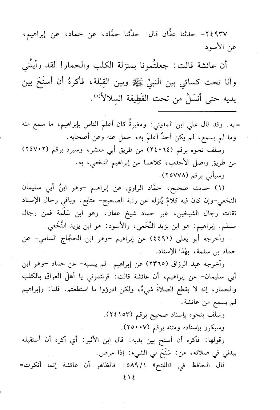 ٢٤٩٣٧ - حَدَّثَنَا عَفَّانُ، قَالَ: حَدَّثَنَا حَمَّادٌ، عَنْ حَمَّادٍ، عَنْ إِبْرَاهِيمَ، عَنْ الْأَسْوَدِ، أَنَّ عَائِشَةَ، قَالَتْ: " جَعَلْتُمُونَا بِمَنْزِلَةِ الْكَلْبِ وَالْحِمَارِ، لَقَدْ رَأَيْتُنِي وَأَنَا تَحْتَ كِسَائِي بَيْنَ النَّبِيِّ صَلَّى اللهُ عَلَيْهِ وَسَلَّمَ، وَبَيْنَ الْقِبْلَةِ، فَأَكْرَهُ أَنْ أَسْنَحَ بَيْنَ يَدَيْهِ، حَتَّى أَنْسَلَّ مِنْ تَحْتِ الْقَطِيفَةِ انْسِلَالًا " (١)