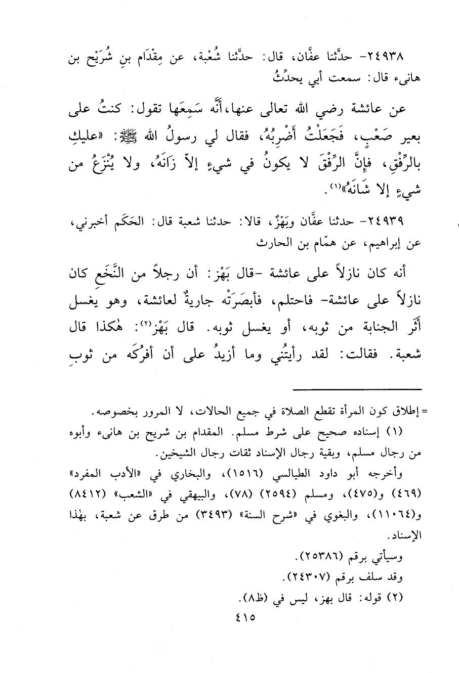 ٢٤٩٣٨ - حَدَّثَنَا عَفَّانُ، قَالَ: حَدَّثَنَا شُعْبَةُ، عَنْ مِقْدَامِ بْنِ شُرَيْحِ بْنِ هَانِئٍ، قَالَ: سَمِعْتُ أَبِي، يُحَدِّثُ، عَنْ عَائِشَةَ رَضِيَ اللهُ تَعَالَى عَنْهَا، أَنَّهُ سَمِعَهَا تَقُولُ: كُنْتُ عَلَى بَعِيرٍ صَعْبٍ، فَجَعَلْتُ أَضْرِبُهُ، فَقَالَ لِي رَسُولُ اللهِ صَلَّى اللهُ عَلَيْهِ وَسَلَّمَ: " عَلَيْكِ بِالرِّفْقِ، فَإِنَّ الرِّفْقَ لَا يَكُونُ فِي شَيْءٍ إِلَّا زَانَهُ، وَلَا يُنْزَعُ مِنْ شَيْءٍ إِلَّا شَانَهُ " (١)