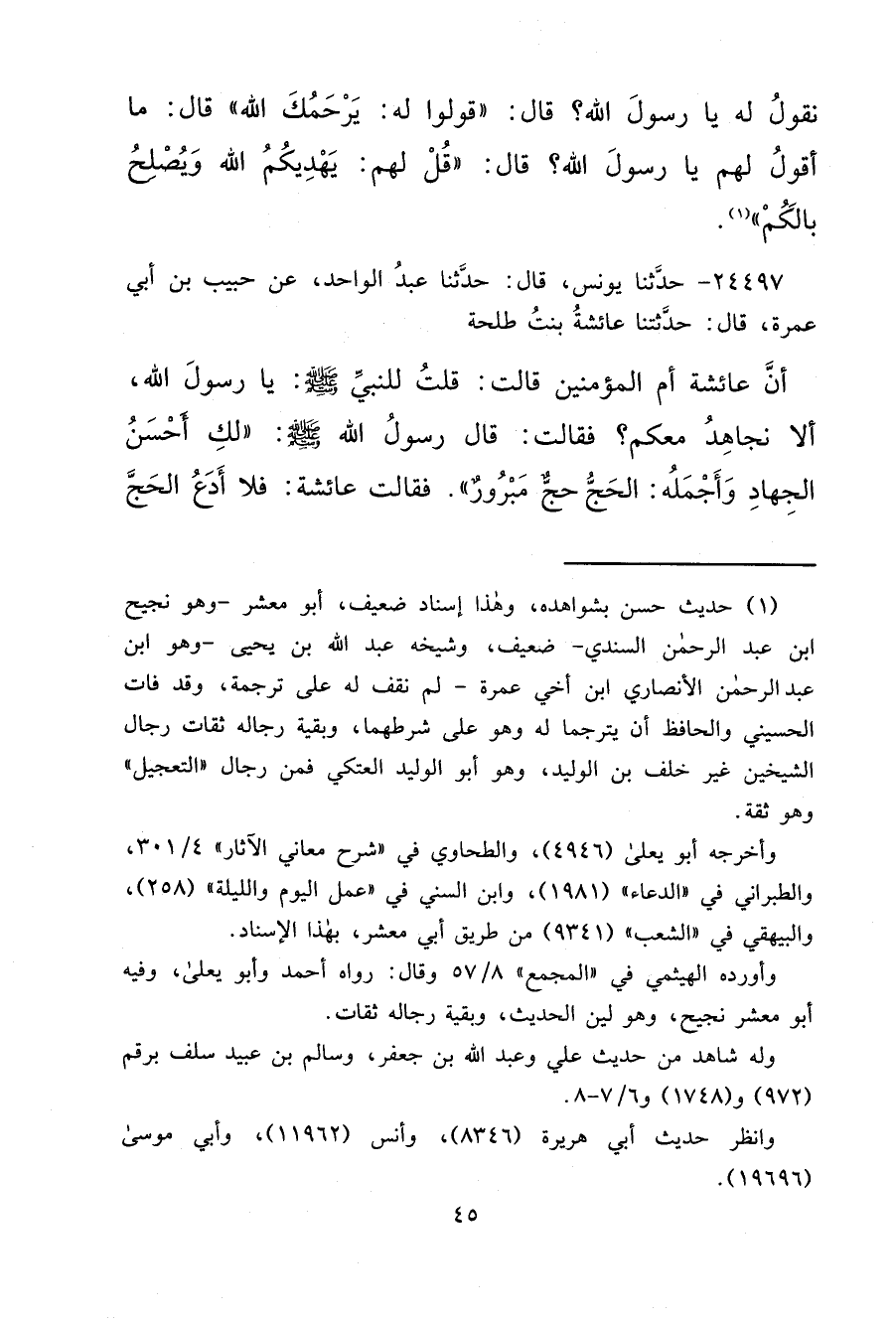 ٢٤٤٩٧ - حَدَّثَنَا يُونُسُ قَالَ: حَدَّثَنَا عَبْدُ الْوَاحِدِ، عَنْ حَبِيبِ بْنِ أَبِي عَمْرَةَ قَالَ: حَدَّثَتْنَا عَائِشَةُ بِنْتُ طَلْحَةَ، أَنَّ عَائِشَةَ أُمَّ الْمُؤْمِنِينَ قَالَتْ: قُلْتُ لِلنَّبِيِّ صَلَّى اللهُ عَلَيْهِ وَسَلَّمَ: يَا رَسُولَ اللهِ، أَلَا نُجَاهِدُ مَعَكَ؟ فَقَالَتْ: قَالَ رَسُولُ اللهِ صَلَّى اللهُ عَلَيْهِ وَسَلَّمَ: " لَكِ أَحْسَنُ الْجِهَادِ، وَأَجْمَلُهُ الْحَجُّ، حَجٌّ مَبْرُورٌ " فَقَالَتْ عَائِشَةُ: " فَلَا أَدَعُ الْحَجَّ