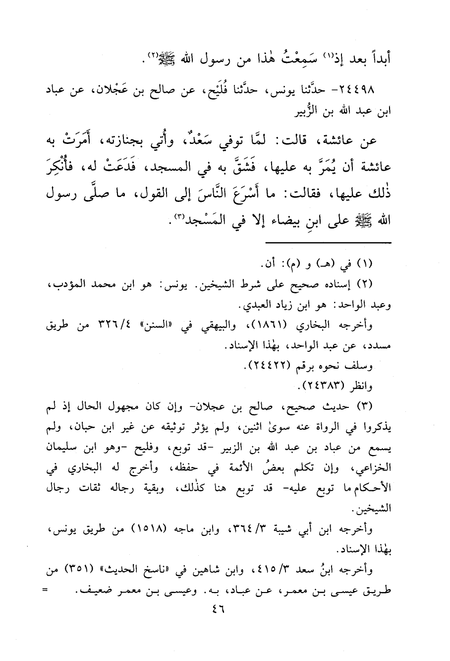 ٢٤٤٩٨ - حَدَّثَنَا يُونُسُ، حَدَّثَنَا فُلَيْحٌ، عَنْ صَالِحِ بْنِ عَجْلَانَ، عَنْ عَبَّادِ بْنِ عَبْدِ اللهِ بْنِ الزُّبَيْرِ، عَنْ عَائِشَةَ، قَالَتْ: لَمَّا تُوُفِّيَ سَعْدٌ، وَأُتِيَ بِجِنَازَتِهِ، أَمَرَتْ بِهِ عَائِشَةُ أَنْ يُمَرَّ بِهِ عَلَيْهَا، فَشُقَّ بِهِ فِي الْمَسْجِدِ، فَدَعَتْ لَهُ، فَأُنْكِرَ ذَلِكَ عَلَيْهَا، فَقَالَتْ: " مَا أَسْرَعَ النَّاسَ إِلَى الْقَوْلِ، مَا صَلَّى رَسُولُ اللهِ صَلَّى اللهُ عَلَيْهِ وَسَلَّمَ عَلَى ابْنِ بَيْضَاءَ إِلَّا فِي الْمَسْجِدِ " (٣)