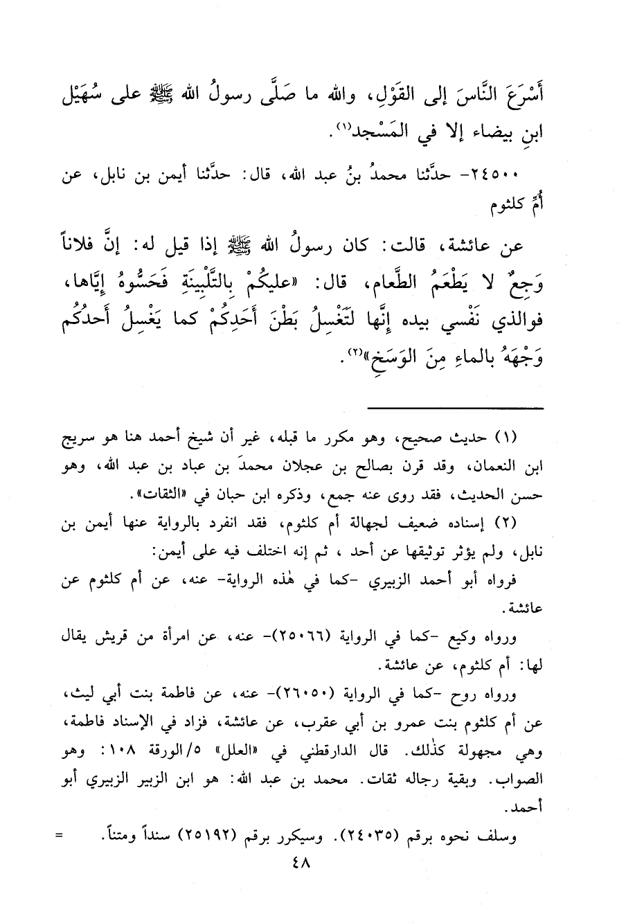 ٢٤٥٠٠ - حَدَّثَنَا مُحَمَّدُ بْنُ عَبْدِ اللهِ، قَالَ: حَدَّثَنَا أَيْمَنُ بْنُ نَابِلٍ، عَنْ أُمِّ كُلْثُومٍ، عَنْ عَائِشَةَ، قَالَتْ: كَانَ رَسُولُ اللهِ صَلَّى اللهُ عَلَيْهِ وَسَلَّمَ، إِذَا قِيلَ لَهُ: إِنَّ فُلَانًا وَجِعٌ لَا يَطْعَمُ الطَّعَامَ، قَالَ: " عَلَيْكُمْ بِالتَّلْبِينَةِ، فَحَسُّوهُ إِيَّاهَا، فَوَالَّذِي نَفْسِي بِيَدِهِ، إِنَّهَا لَتَغْسِلُ بَطْنَ أَحَدِكُمْ، كَمَا يَغْسِلُ أَحَدُكُمْ وَجْهَهُ بِالْمَاءِ مِنَ الْوَسَخِ " (٢)