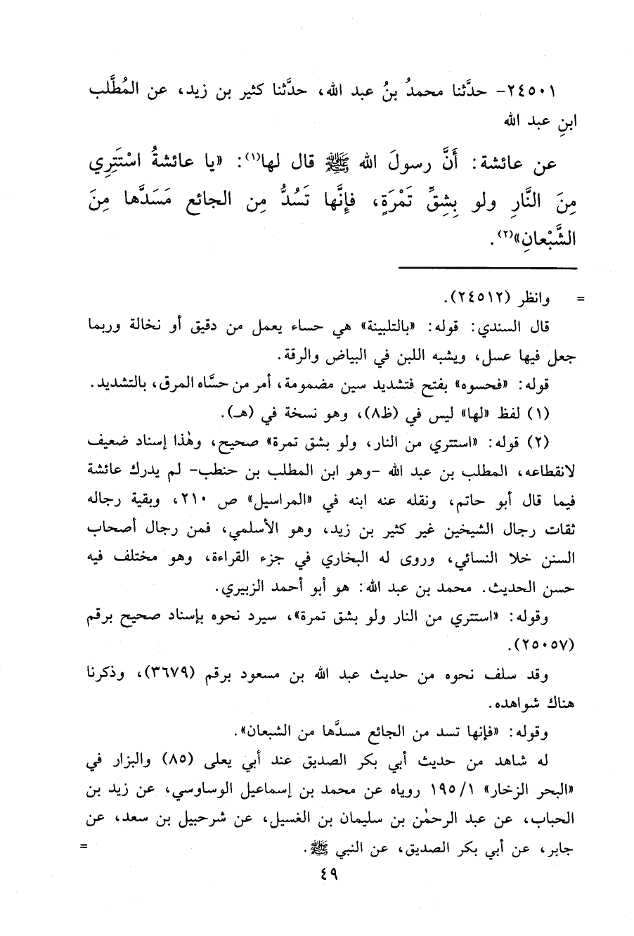 ٢٤٥٠١ - حَدَّثَنَا مُحَمَّدُ بْنُ عَبْدِ اللهِ، حَدَّثَنَا كَثِيرُ بْنُ زَيْدٍ، عَنْ الْمُطَّلِبِ بْنِ عَبْدِ اللهِ، عَنْ عَائِشَةَ، أَنَّ رَسُولَ اللهِ صَلَّى اللهُ عَلَيْهِ وَسَلَّمَ قَالَ لَهَا (١) : " يَا عَائِشَةُ، اسْتَتِرِي مِنَ النَّارِ وَلَوْ بِشِقِّ تَمْرَةٍ، فَإِنَّهَا تَسُدُّ مِنَ الْجَائِعِ مَسَدَّهَا مِنَ الشَّبْعَانِ " (٢)