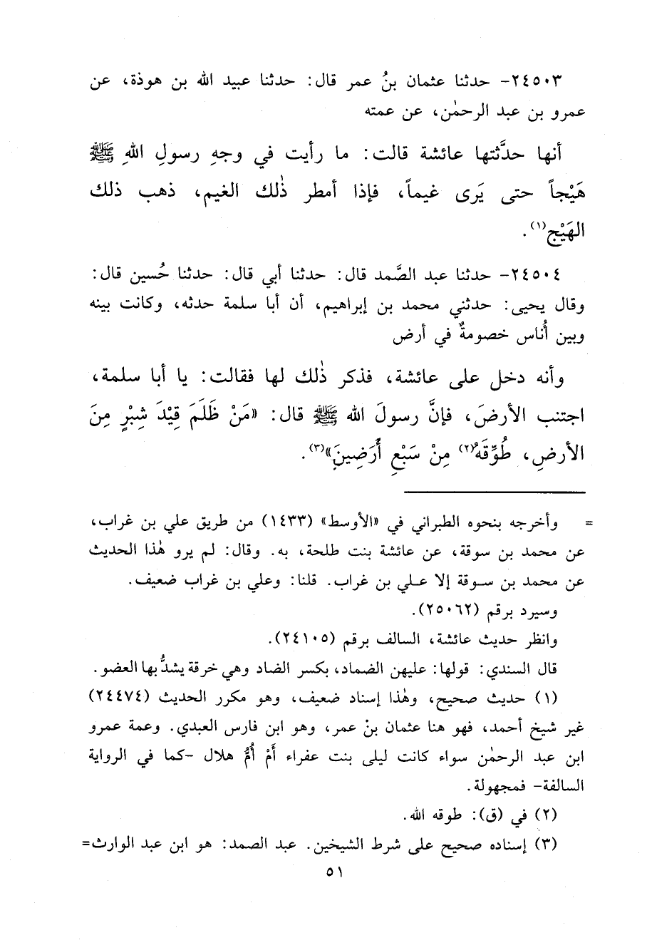٢٤٥٠٤ - حَدَّثَنَا عَبْدُ الصَّمَدِ، قَالَ: حَدَّثَنَا أَبِي، قَالَ: حَدَّثَنَا حُسَيْنٌ، قَالَ: وَقَالَ يَحْيَى: حَدَّثَنِي مُحَمَّدُ بْنُ إِبْرَاهِيمَ، أَنَّ أَبَا سَلَمَةَ، حَدَّثَهُ، وَكَانَتْ بَيْنَهُ وَبَيْنَ أُنَاسٍ خُصُومَةٌ فِي أَرْضٍ، وَأَنَّهُ دَخَلَ عَلَى عَائِشَةَ، فَذَكَرَ ذَلِكَ لَهَا، فَقَالَتْ: يَا أَبَا سَلَمَةَ، اجْتَنِبِ الْأَرْضَ، فَإِنَّ رَسُولَ اللهِ صَلَّى اللهُ عَلَيْهِ وَسَلَّمَ، قَالَ: " مَنْ ظَلَمَ قِيدَ شِبْرٍ مِنَ الْأَرْضِ، طُوِّقَهُ (٢) مِنْ سَبْعِ أَرَضِينَ " (٣)