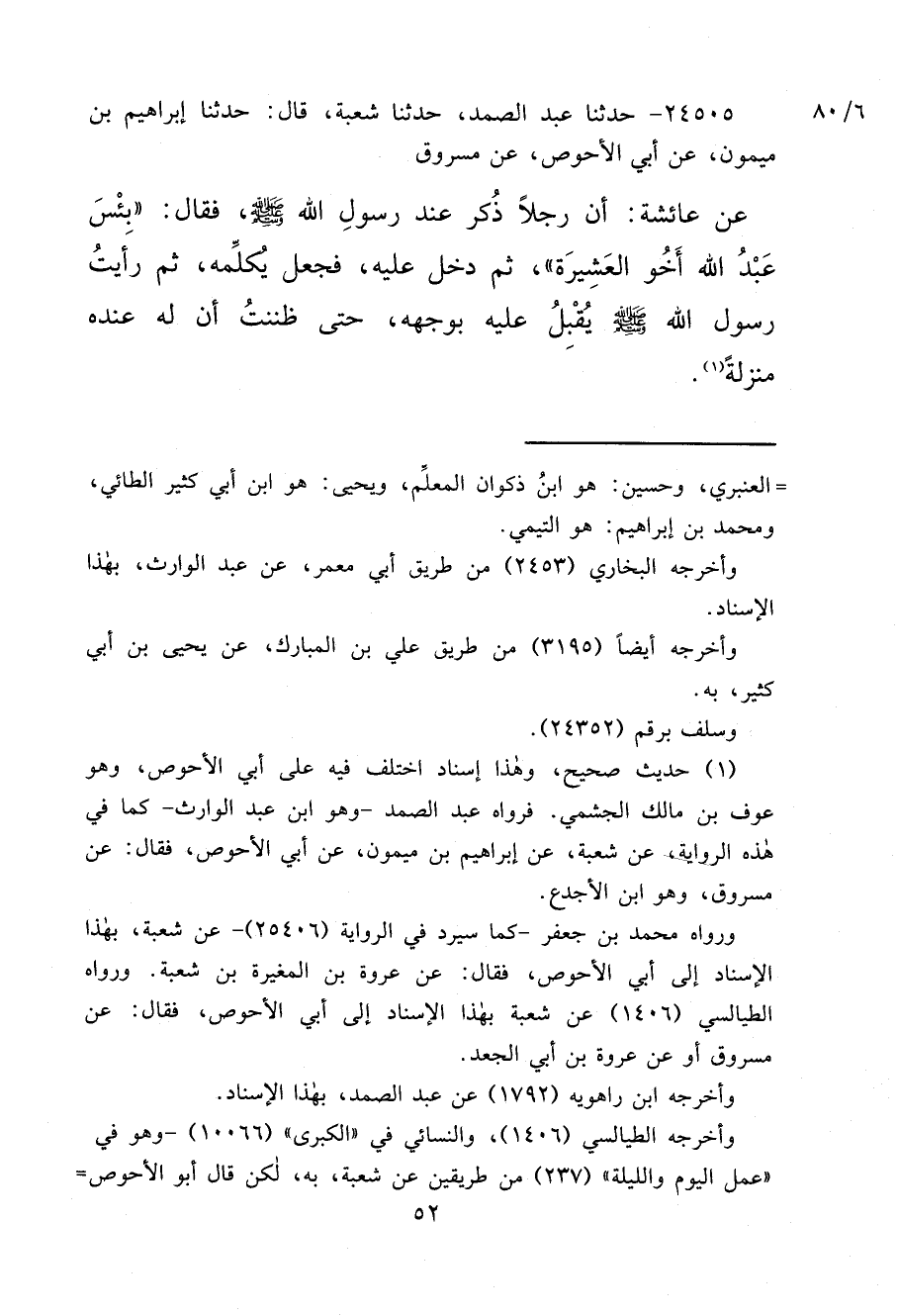 ٢٤٥٠٥ - حَدَّثَنَا عَبْدُ الصَّمَدِ، حَدَّثَنَا شُعْبَةُ، قَالَ: حَدَّثَنَا إِبْرَاهِيمُ بْنُ مَيْمُونٍ، عَنْ أَبِي الْأَحْوَصِ، عَنْ مَسْرُوقٍ، عَنْ عَائِشَةَ، أَنَّ رَجُلًا ذُكِرَ عِنْدَ رَسُولِ اللهِ صَلَّى اللهُ عَلَيْهِ وَسَلَّمَ، فَقَالَ: " بِئْسَ عَبْدُ اللهِ أَخُو الْعَشِيرَةِ "، ثُمَّ دَخَلَ عَلَيْهِ، فَجَعَلَ يُكَلِّمُهُ، ثُمَّ رَأَيْتُ رَسُولَ اللهِ صَلَّى اللهُ عَلَيْهِ وَسَلَّمَ، يُقْبِلُ عَلَيْهِ بِوَجْهِهِ، حَتَّى ظَنَنْتُ أَنَّ لَهُ عِنْدَهُ مَنْزِلَةً (١)