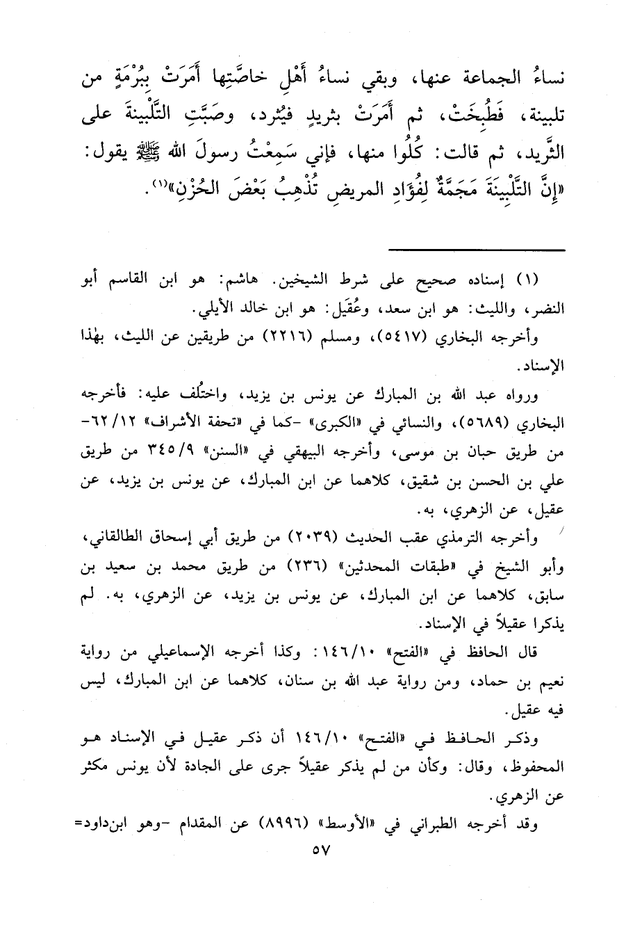 نِسَاءُ الْجَمَاعَةِ عَنْهَا، وَبَقِيَ نِسَاءُ أَهْلِ خَاصَّتِهَا، أَمَرَتْ بِبُرْمَةٍ مِنْ تَلْبِينَةٍ، فَطُبِخَتْ، ثُمَّ أَمَرَتْ بِثَرِيدٍ فَيُثْرَدُ، وَصَبَّتِ التَّلْبِينَةَ عَلَى الثَّرِيدِ، ثُمَّ قَالَتْ: كُلُوا مِنْهَا، فَإِنِّي سَمِعْتُ رَسُولَ اللهِ صَلَّى اللهُ عَلَيْهِ وَسَلَّمَ يَقُولُ: " إِنَّ التَّلْبِينَةَ مَجَمَّةٌ لِفُؤَادِ الْمَرِيضِ، تُذْهِبُ بَعْضَ الْحُزْنِ " (١)