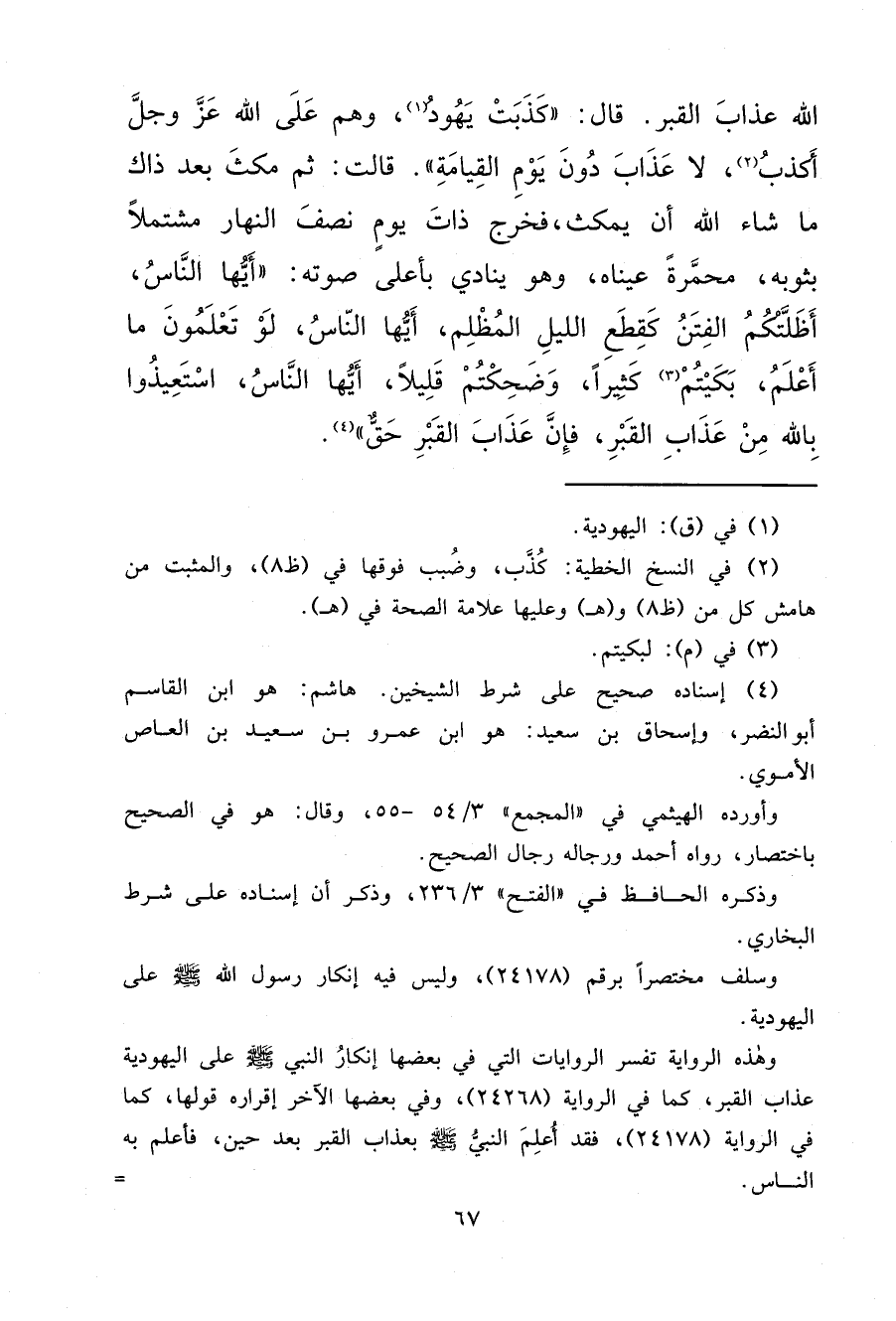 وهذه الرواية تفسر الروايات التي في بعضها إنكارُ النبي صَلَّى اللهُ عَلَيْهِ وَسَلَّمَ على اليهودية عذاب القبر، كما في الرواية (٢٤٢٦٨) ، وفي بعضها الآخر إقراره قولها، كما في الرواية (٢٤١٧٨) ، فقد أُعلِمَ النبيُّ صَلَّى اللهُ عَلَيْهِ وَسَلَّمَ بعذاب القبر بعد حين، فأعلم به الناس.=