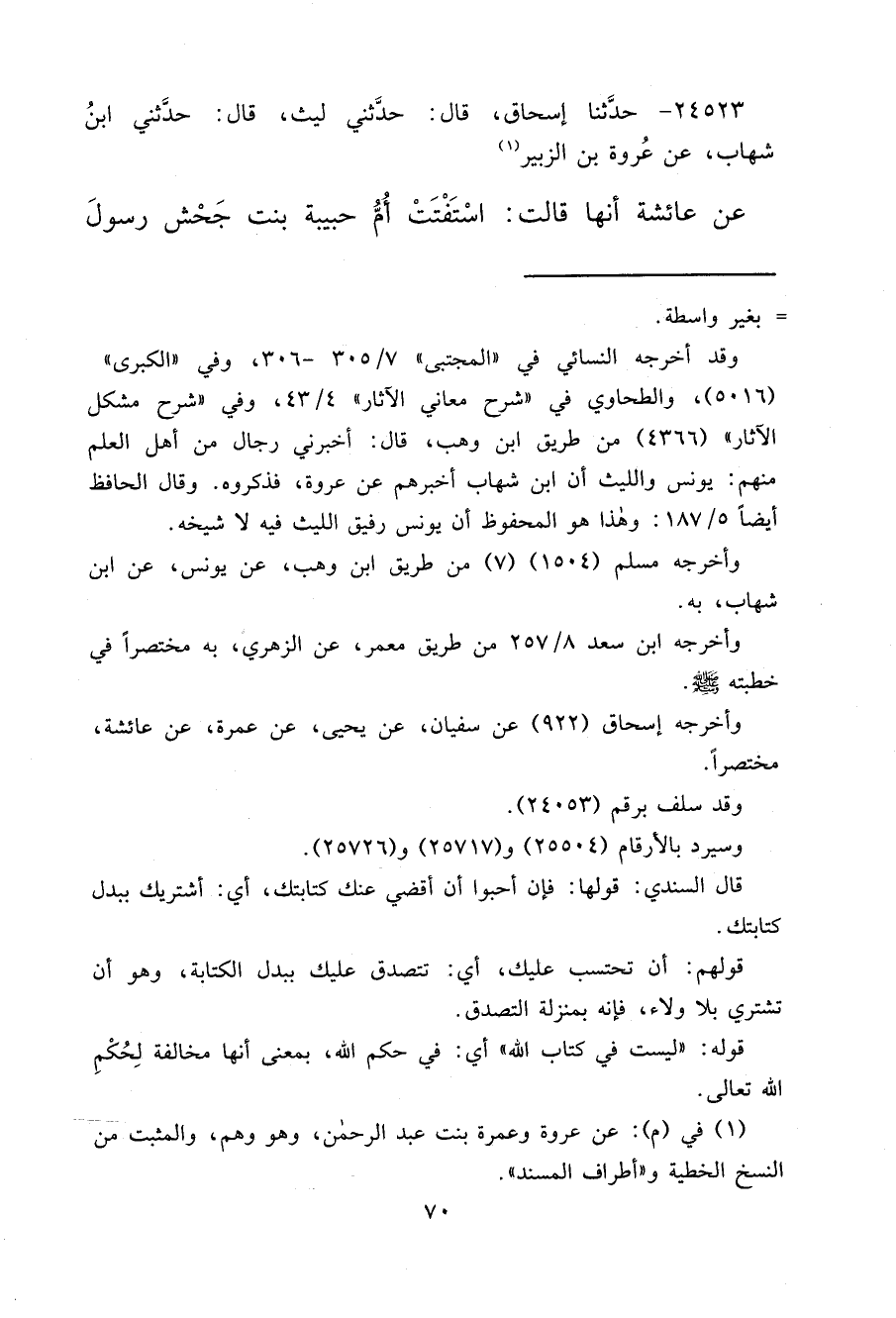 ٢٤٥٢٣ - حَدَّثَنَا إِسْحَاقُ، قَالَ: حَدَّثَنِي لَيْثٌ، قَالَ: حَدَّثَنِي ابْنُ شِهَابٍ، عَنْ عُرْوَةَ بْنِ الزُّبَيْرِ، (١) عَنْ عَائِشَةَ، أَنَّهَا قَالَتْ: اسْتَفْتَتْ أُمُّ حَبِيبَةَ بِنْتُ جَحْشٍ رَسُولَ