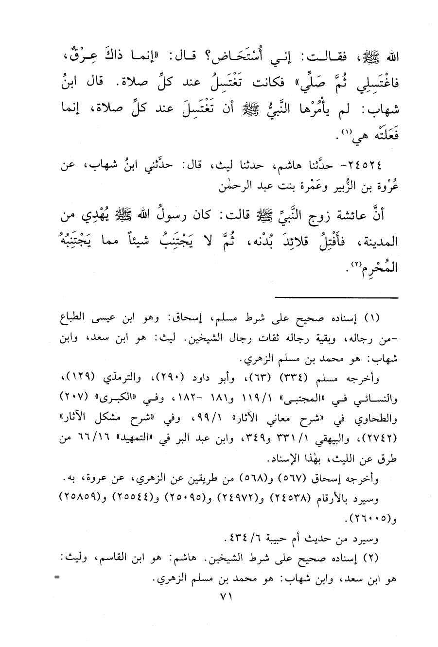 ٢٤٥٢٤ - حَدَّثَنَا هَاشِمٌ، حَدَّثَنَا لَيْثٌ، قَالَ: حَدَّثَنِي ابْنُ شِهَابٍ، عَنْ عُرْوَةَ بْنِ الزُّبَيْرِ، وَعَمْرَةَ بِنْتِ عَبْدِ الرَّحْمَنِ، أَنَّ عَائِشَةَ، زَوْجَ النَّبِيِّ صَلَّى اللهُ عَلَيْهِ وَسَلَّمَ، قَالَتْ: " كَانَ رَسُولُ اللهِ صَلَّى اللهُ عَلَيْهِ وَسَلَّمَ يُهْدِي مِنَ الْمَدِينَةِ فَأَفْتِلُ قَلَائِدَ بُدْنِهِ، ثُمَّ لَا يَجْتَنِبُ شَيْئًا مِمَّا يَجْتَنِبُهُ الْمُحْرِمُ " (٢)