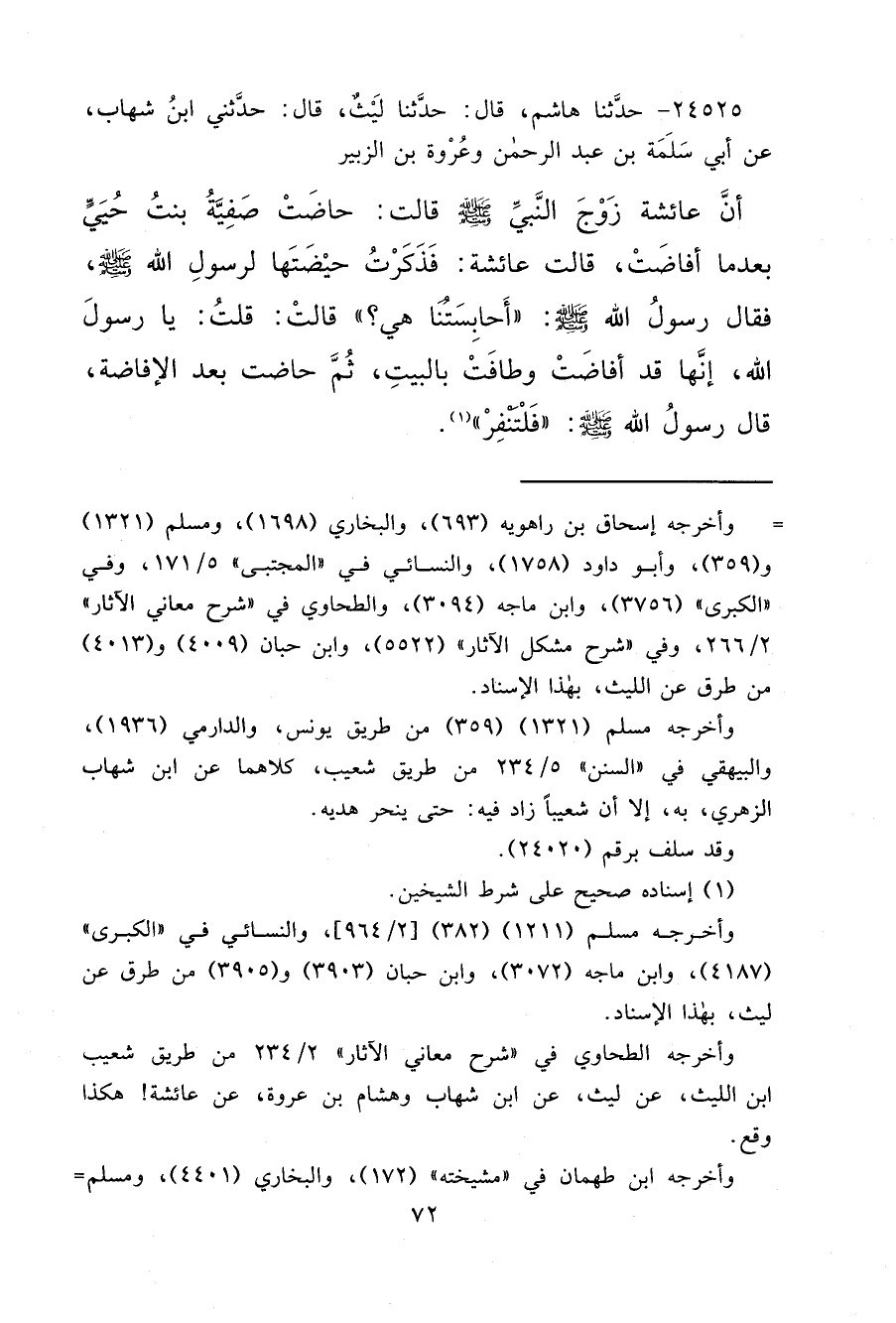 ٢٤٥٢٥ - حَدَّثَنَا هَاشِمٌ، قَالَ: حَدَّثَنَا لَيْثٌ، قَالَ: حَدَّثَنِي ابْنُ شِهَابٍ، عَنْ أَبِي سَلَمَةَ بْنِ عَبْدِ الرَّحْمَنِ، وَعُرْوَةَ بْنِ الزُّبَيْرِ، أَنَّ عَائِشَةَ، زَوْجَ النَّبِيِّ صَلَّى اللهُ عَلَيْهِ وَسَلَّمَ، قَالَتْ: حَاضَتْ صَفِيَّةُ بِنْتُ حُيَيٍّ بَعْدَمَا أَفَاضَتْ، قَالَتْ عَائِشَةُ: فَذَكَرَتْ حَيْضَتَهَا لِرَسُولِ اللهِ صَلَّى اللهُ عَلَيْهِ وَسَلَّمَ، فَقَالَ رَسُولُ اللهِ صَلَّى اللهُ عَلَيْهِ وَسَلَّمَ: " أَحَابِسَتُنَا هِيَ؟ " قَالَتْ: قُلْتُ: يَا رَسُولَ اللهِ، إِنَّهَا قَدْ أَفَاضَتْ، وَطَافَتْ بِالْبَيْتِ، ثُمَّ حَاضَتْ بَعْدَ الْإِفَاضَةِ، قَالَ رَسُولُ اللهِ صَلَّى اللهُ عَلَيْهِ وَسَلَّمَ: " فَلْتَنْفِرْ " (١)