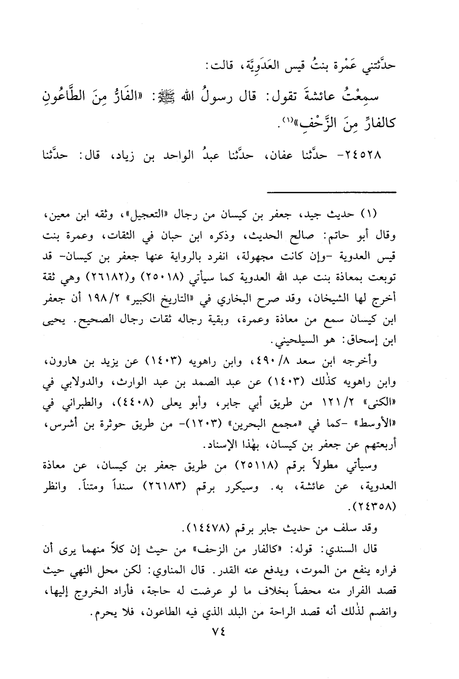 حَدَّثَتْنِي عَمْرَةُ بِنْتُ قَيْسٍ الْعَدَوِيَّةُ، قَالَتْ: سَمِعْتُ عَائِشَةَ، تَقُولُ: قَالَ رَسُولُ اللهِ صَلَّى اللهُ عَلَيْهِ وَسَلَّمَ: " الْفَارُّ مِنَ الطَّاعُونِ، كَالْفَارِّ مِنَ الزَّحْفِ " (١)