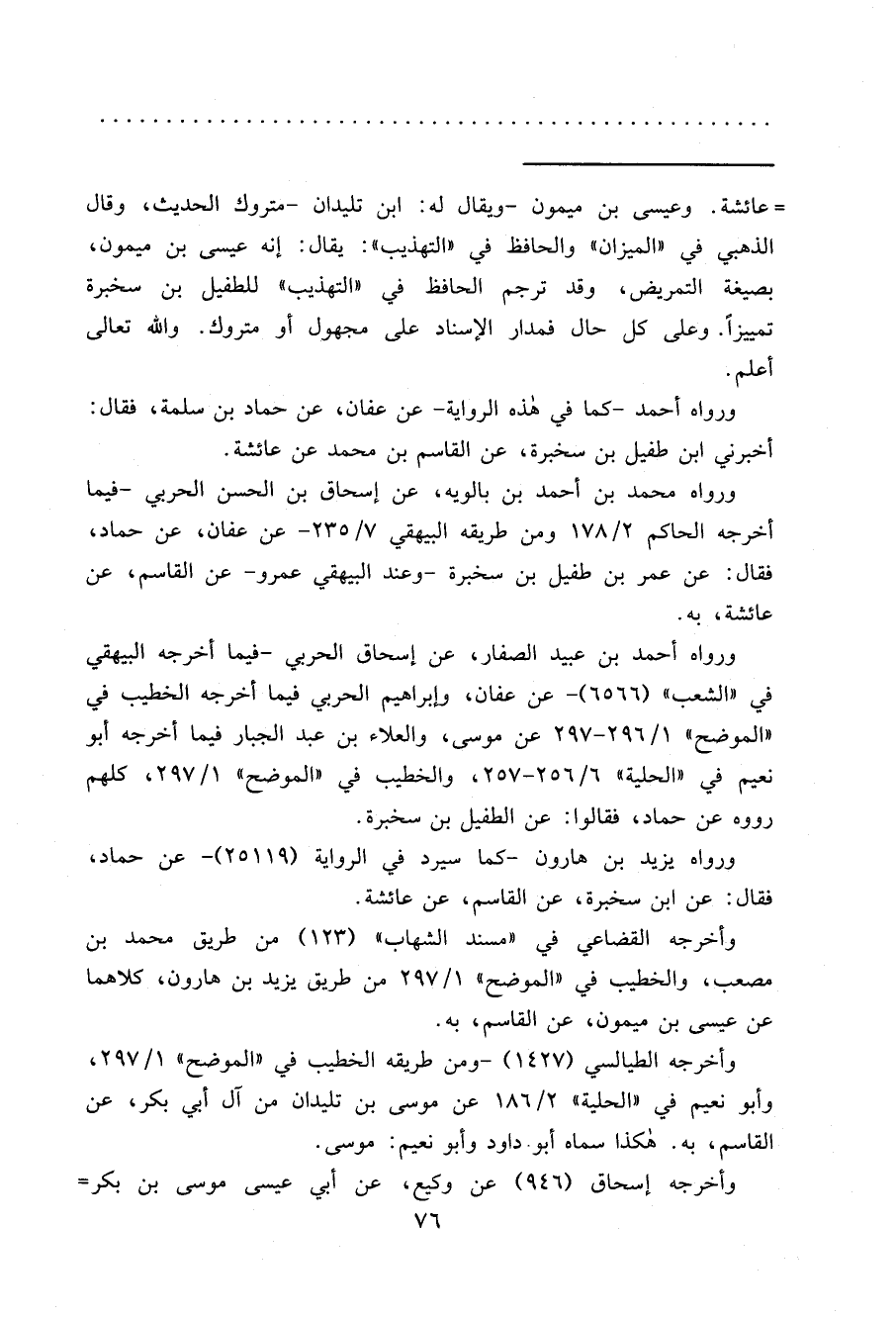 ورواه أحمد - كما في هذه الرواية - عن عفان، عن حماد بن سلمة، فقال: أخبرني ابن طفيل بن سخبرة، عن القاسم بن محمد عن عائشة.
