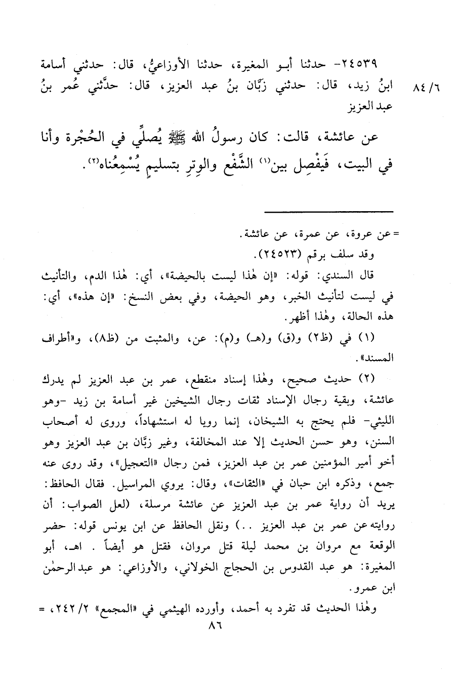 ٢٤٥٣٩ - حَدَّثَنَا أَبُو الْمُغِيرَةِ، حَدَّثَنَا الْأَوْزَاعِيُّ، قَالَ: حَدَّثَنِي أُسَامَةُ بْنُ زَيْدٍ، قَالَ: حَدَّثَنِي زَبَّانُ بْنُ عَبْدِ الْعَزِيزِ، قَالَ: حَدَّثَنِي عُمَرُ بْنُ عَبْدِ الْعَزِيزِ، عَنْ عَائِشَةَ، قَالَتْ: " كَانَ رَسُولُ اللهِ صَلَّى اللهُ عَلَيْهِ وَسَلَّمَ يُصَلِّي فِي الْحُجْرَةِ وَأَنَا فِي الْبَيْتِ، فَيَفْصِلُ بَيْنَ (١) الشَّفْعِ وَالْوَتْرِ بِتَسْلِيمٍ يُسْمِعُنَاهُ " (٢)
