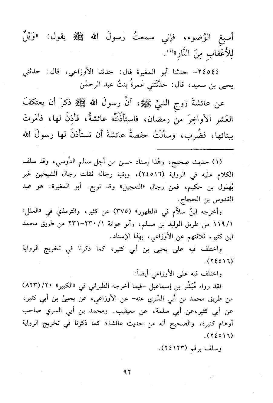 ٢٤٥٤٤ - حَدَّثَنَا أَبُو الْمُغِيرَةِ، قَالَ: حَدَّثَنَا الْأَوْزَاعِيُّ، قَالَ: حَدَّثَنِي يَحْيَى بْنُ سَعِيدٍ، قَالَ: حَدَّثَتْنِي عَمْرَةُ بِنْتُ عَبْدِ الرَّحْمَنِ، عَنْ عَائِشَةَ، زَوْجِ النَّبِيِّ صَلَّى اللهُ عَلَيْهِ وَسَلَّمَ، أَنَّ رَسُولَ اللهِ صَلَّى اللهُ عَلَيْهِ وَسَلَّمَ، ذَكَرَ أَنْ يَعْتَكِفَ الْعَشْرَ الْأَوَاخِرَ مِنْ رَمَضَانَ، فَاسْتَأْذَنَتْهُ عَائِشَةُ، فَأَذِنَ لَهَا، فَأَمَرَتْ بِبِنَائِهَا، فَضُرِبَ، وَسَأَلَتْ حَفْصَةُ عَائِشَةَ أَنْ تَسْتَأْذِنَ لَهَا رَسُولَ اللهِ صَلَّى اللهُ عَلَيْهِ وَسَلَّمَ،