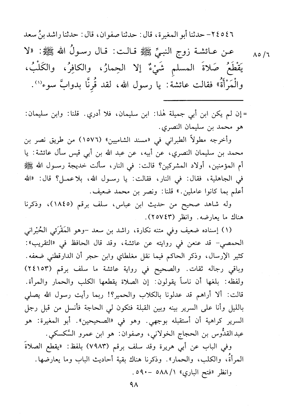 ٢٤٥٤٦ - حَدَّثَنَا أَبُو الْمُغِيرَةِ، قَالَ: حَدَّثَنَا صَفْوَانُ، قَالَ: حَدَّثَنَا رَاشِدُ بْنُ سَعْدٍ، عَنْ عَائِشَةَ، زَوْجِ النَّبِيِّ صَلَّى اللهُ عَلَيْهِ وَسَلَّمَ، قَالَتْ: قَالَ رَسُولُ اللهِ صَلَّى اللهُ عَلَيْهِ وَسَلَّمَ: " لَا يَقْطَعُ صَلَاةَ الْمُسْلِمِ شَيْءٌ إِلَّا الْحِمَارُ، وَالْكَافِرُ، وَالْكَلْبُ، وَالْمَرْأَةُ"، فَقَالَتْ عَائِشَةُ: يَا رَسُولَ اللهِ، لَقَدْ قُرِنَّا بِدَوَابِّ سُوءٍ (١)