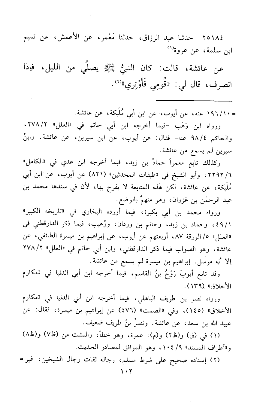٢٥١٨٤ - حَدَّثَنَا عَبْدُ الرَّزَّاقِ، حَدَّثَنَا مَعْمَرٌ، عَنِ الْأَعْمَشِ، عَنْ تَمِيمِ بْنِ سَلَمَةَ، عَنْ عُرْوَةَ، (١) عَنْ عَائِشَةَ، قَالَتْ: كَانَ النَّبِيُّ صَلَّى اللهُ عَلَيْهِ وَسَلَّمَ يُصَلِّي مِنَ اللَّيْلِ، فَإِذَا انْصَرَفَ، قَالَ لِي: " قُومِي فَأَوْتِرِي " (٢)
