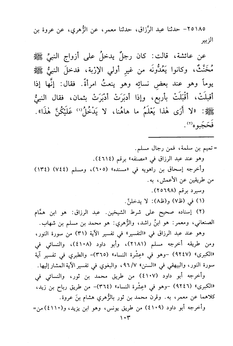 ٢٥١٨٥ - حَدَّثَنَا عَبْدُ الرَّزَّاقِ، حَدَّثَنَا مَعْمَرٌ، عَنِ الزُّهْرِيِّ، عَنْ عُرْوَةَ بْنِ الزُّبَيْرِ، عَنْ عَائِشَةَ، قَالَتْ: كَانَ رَجُلٌ يَدْخُلُ عَلَى أَزْوَاجِ النَّبِيِّ صَلَّى اللهُ عَلَيْهِ وَسَلَّمَ مُخَنَّثٌ، وَكَانُوا يَعُدُّونَهُ مِنْ غَيْرِ أُولِيَ الْإِرْبَةِ، فَدَخَلَ النَّبِيُّ صَلَّى اللهُ عَلَيْهِ وَسَلَّمَ يَوْمًا وَهُوَ عِنْدَ بَعْضِ نِسَائِهِ وَهُوَ يَنْعَتُ امْرَأَةً. فَقَالَ: إِنَّهَا إِذَا أَقْبَلَتْ، أَقْبَلَتْ بِأَرْبَعٍ، وَإِذَا أَدْبَرَتْ أَدْبَرَتْ بِثَمَانٍ، فَقَالَ النَّبِيُّ صَلَّى اللهُ عَلَيْهِ وَسَلَّمَ: " لَا أَرَى هَذَا يَعْلَمُ مَا هَاهُنَا، لَا يَدْخُلْ (١) عَلَيْكُنَّ هَذَا " فَحَجَبُوهُ (٢)