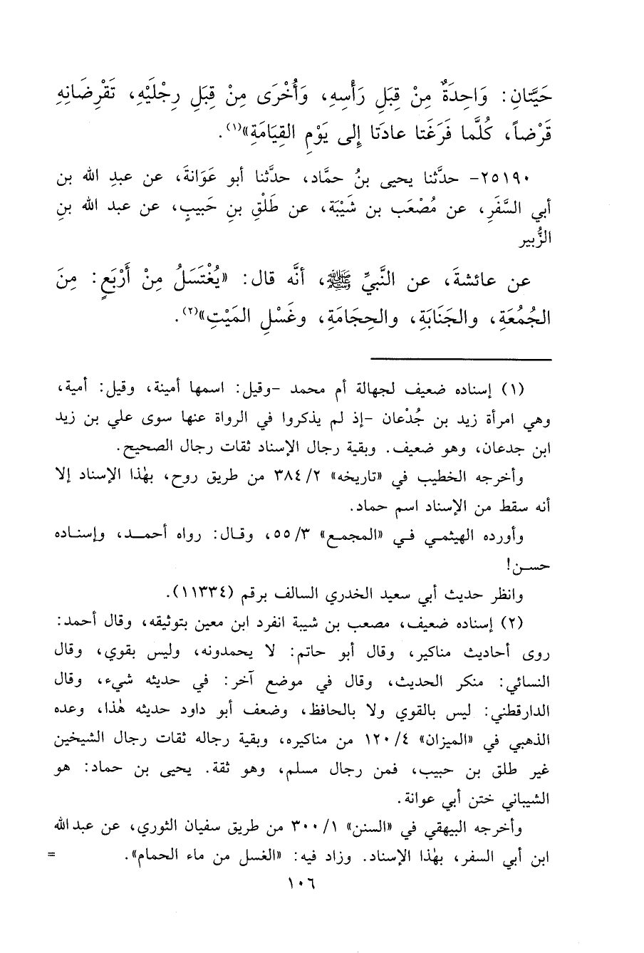 ٢٥١٩٠ - حَدَّثَنَا يَحْيَى بْنُ حَمَّادٍ، حَدَّثَنَا أَبُو عَوَانَةَ، عَنْ عَبْدِ اللهِ بْنِ أَبِي السَّفَرِ، عَنْ مُصْعَبِ بْنِ شَيْبَةَ، عَنْ طَلْقِ بْنِ حَبِيبٍ، عَنْ عَبْدِ اللهِ بْنِ الزُّبَيْرِ، عَنْ عَائِشَةَ، عَنِ النَّبِيِّ صَلَّى اللهُ عَلَيْهِ وَسَلَّمَ أَنَّهُ قَالَ: " يُغْتَسَلُ مِنْ أَرْبَعٍ: مِنَ الْجُمُعَةِ، وَالْجَنَابَةِ، وَالْحِجَامَةِ، وَغَسْلِ الْمَيِّتِ " (٢)