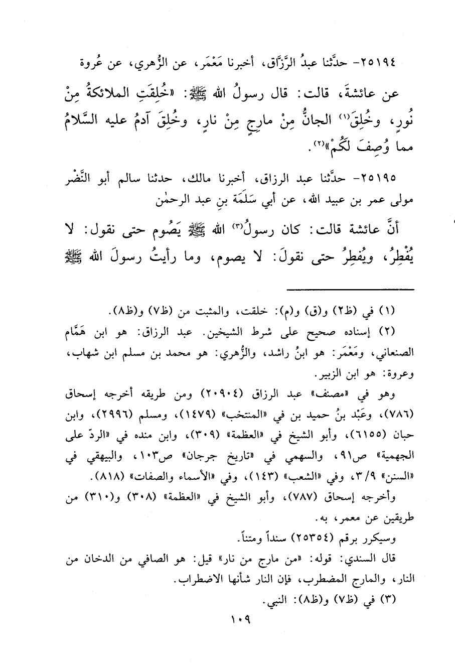 ٢٥١٩٤ - حَدَّثَنَا عَبْدُ الرَّزَّاقِ، أَخْبَرَنَا مَعْمَرٌ، عَنِ الزُّهْرِيِّ، عَنْ عُرْوَةَ، عَنْ عَائِشَةَ، قَالَتْ: قَالَ رَسُولُ اللهِ صَلَّى اللهُ عَلَيْهِ وَسَلَّمَ: " خُلِقَتِ الْمَلَائِكَةُ مِنْ نُورٍ، وَخُلِقَ (١) الْجَانُّ مِنْ مَارِجٍ مِنْ نَارٍ، وَخُلِقَ آدَمُ عَلَيْهِ السَّلَامُ مِمَّا وُصِفَ لَكُمْ " (٢)