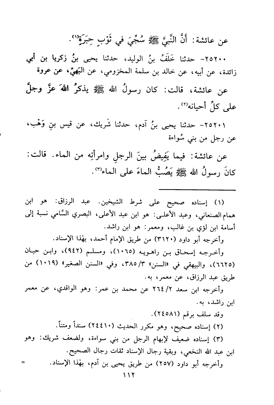 ٢٥٢٠٠ - حَدَّثَنَا خَلَفُ بْنُ الْوَلِيدِ، حَدَّثَنَا يَحْيَى بْنُ زَكَرِيَّا بْنِ أَبِي زَائِدَةَ، عَنْ أَبِيهِ، عَنْ خَالِدِ بْنِ سَلَمَةَ الْمَخْزُومِيِّ، عَنِ الْبَهِيِّ، عَنْ عُرْوَةَ، عَنْ عَائِشَةَ، قَالَتْ: " كَانَ رَسُولُ اللهِ صَلَّى اللهُ عَلَيْهِ وَسَلَّمَ يَذْكُرُ اللهَ عَزَّ وَجَلَّ عَلَى كُلِّ أَحْيَانِهِ " (٢)