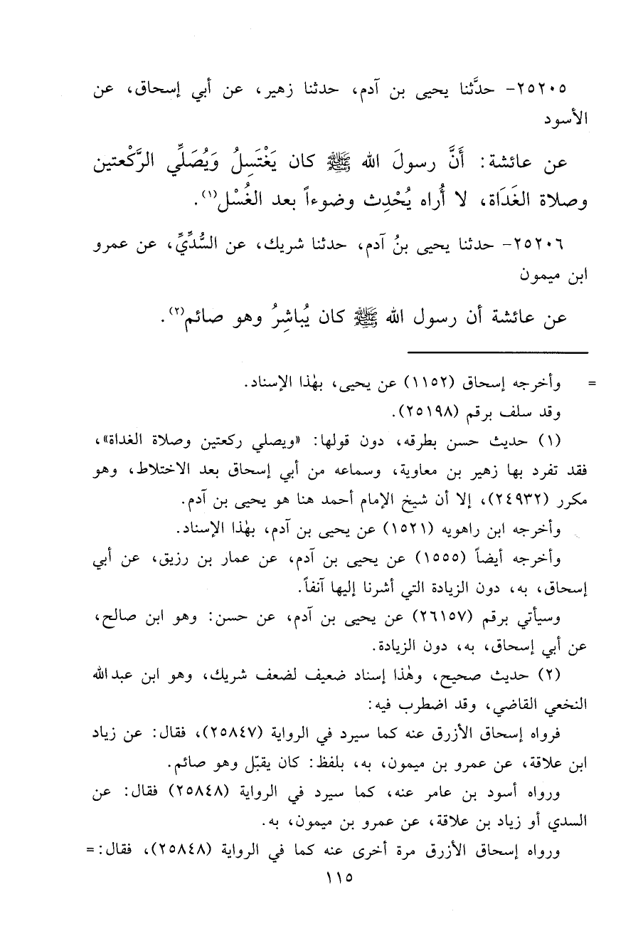 ٢٥٢٠٥ - حَدَّثَنَا يَحْيَى بْنُ آدَمَ، حَدَّثَنَا زُهَيْرٌ، عَنْ أَبِي إِسْحَاقَ، عَنِ الْأَسْوَدِ، عَنْ عَائِشَةَ: " أَنَّ رَسُولَ اللهِ صَلَّى اللهُ عَلَيْهِ وَسَلَّمَ كَانَ يَغْتَسِلُ وَيُصَلِّي الرَّكْعَتَيْنِ وَصَلَاةَ الْغَدَاةِ، لَا أَرَاهُ يُحْدِثُ وُضُوءًا بَعْدَ الْغُسْلِ " (١)