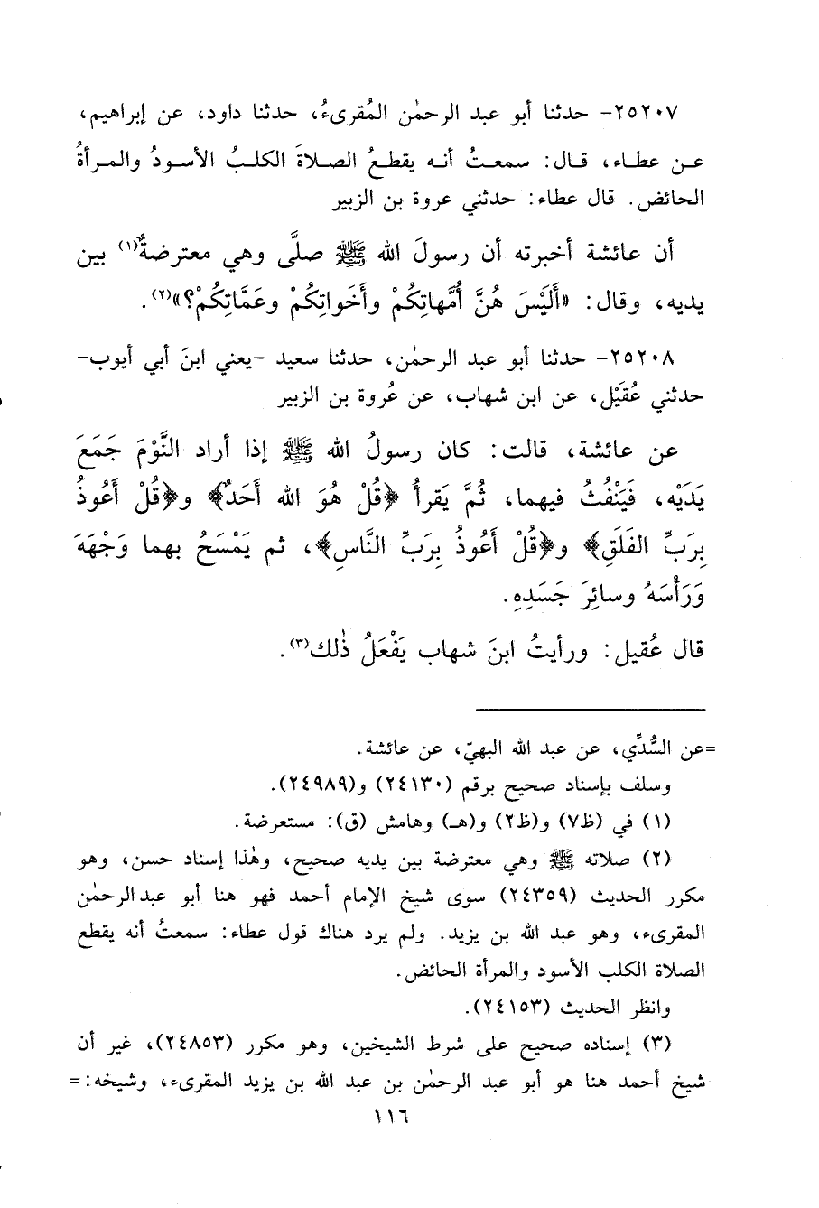 ٢٥٢٠٧ - حَدَّثَنَا أَبُو عَبْدِ الرَّحْمَنِ الْمُقْرِئُ، حَدَّثَنَا دَاوُدُ، عَنْ إِبْرَاهِيمَ، عَنْ عَطَاءٍ، قَالَ: سَمِعْتُ أَنَّهُ: يَقْطَعُ الصَّلَاةَ الْكَلْبُ الْأَسْوَدُ وَالْمَرْأَةُ الْحَائِضُ، قَالَ عَطَاءٌ: حَدَّثَنِي عُرْوَةُ بْنُ الزُّبَيْرِ: أَنَّ عَائِشَةَ أَخْبَرَتْهُ أَنَّ رَسُولَ اللهِ صَلَّى اللهُ عَلَيْهِ وَسَلَّمَ صَلَّى وَهِيَ مُعْتَرِضَةٌ (١) بَيْنَ يَدَيْهِ، وَقَالَ: " أَلَيْسَ هُنَّ أُمَّهَاتِكُمْ وَأَخَوَاتِكُمْ وَعَمَّاتِكُمْ؟ " (٢)
