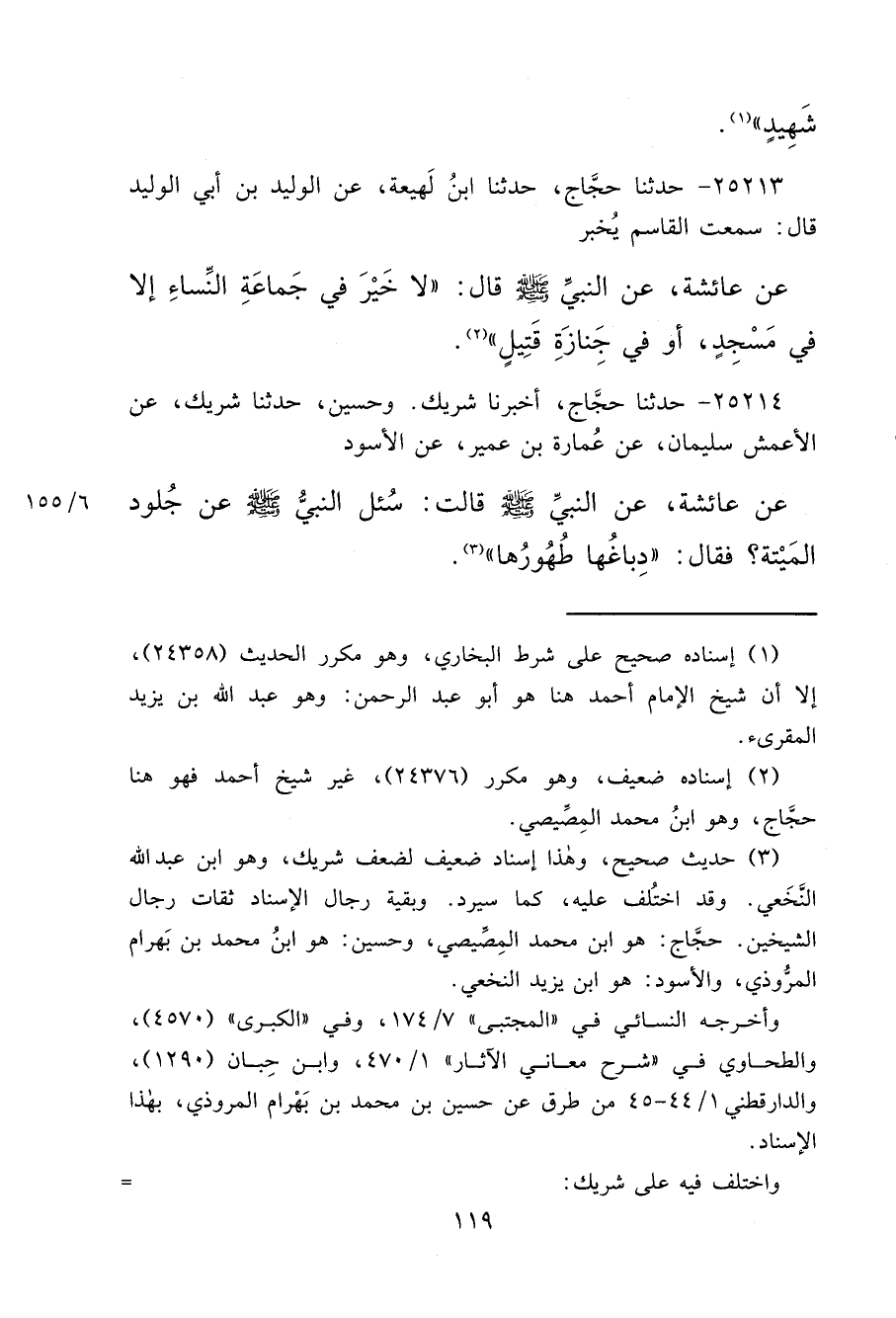 ٢٥٢١٤ - حَدَّثَنَا حَجَّاجٌ، أَخْبَرَنَا شَرِيكٌ، وَحُسَيْنٌ، حَدَّثَنَا شَرِيكٌ، عَنِ الْأَعْمَشِ سُلَيْمَانَ، عَنْ عُمَارَةَ بْنِ عُمَيْرٍ، عَنِ الْأَسْوَدِ، عَنْ عَائِشَةَ، عَنِ النَّبِيِّ صَلَّى اللهُ عَلَيْهِ وَسَلَّمَ قَالَتْ: سُئِلَ النَّبِيُّ صَلَّى اللهُ عَلَيْهِ وَسَلَّمَ عَنْ جُلُودِ الْمَيْتَةِ؟ فَقَالَ: " دِبَاغُهَا طَهُورُهَا " (٣)